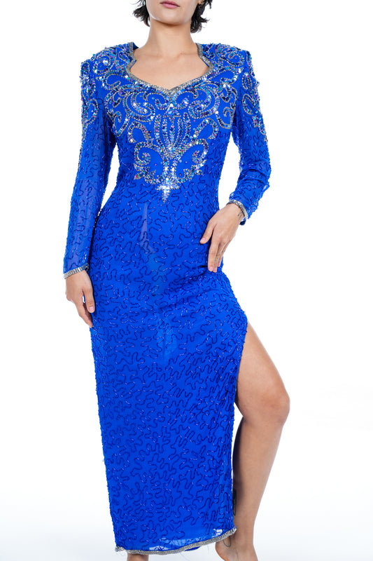 1980s Jovani Blue Beaded Dress