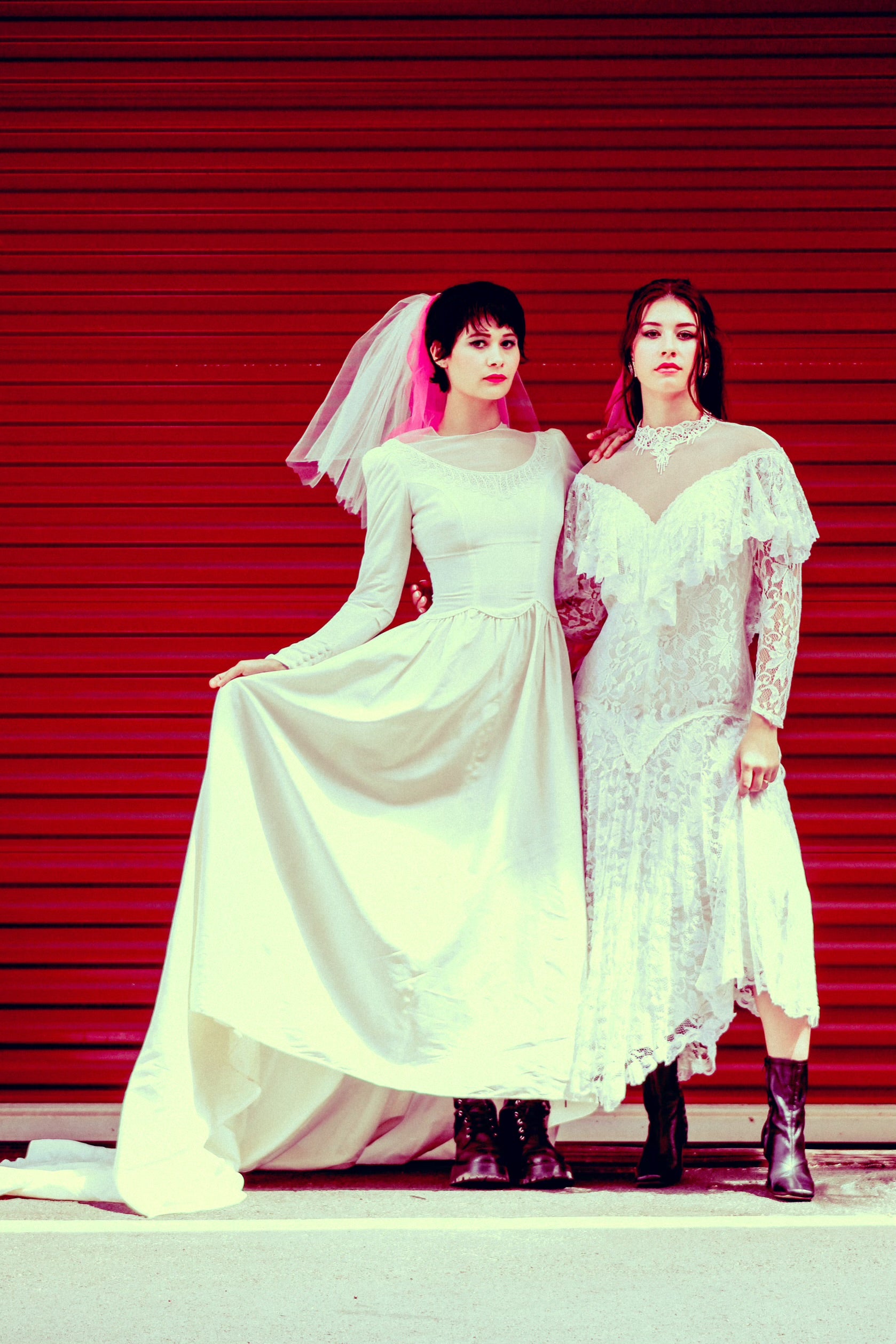 We introduce our sleek 1940's bridal gown features a sophisticated and classic silhouette, fitted bodice, long sleeves with buttoned cuffs, high neckline with satin buttons, and a train. Made of white satin fabric, this gown exudes timeless beauty and a bit of an edge with our Punk archetype.