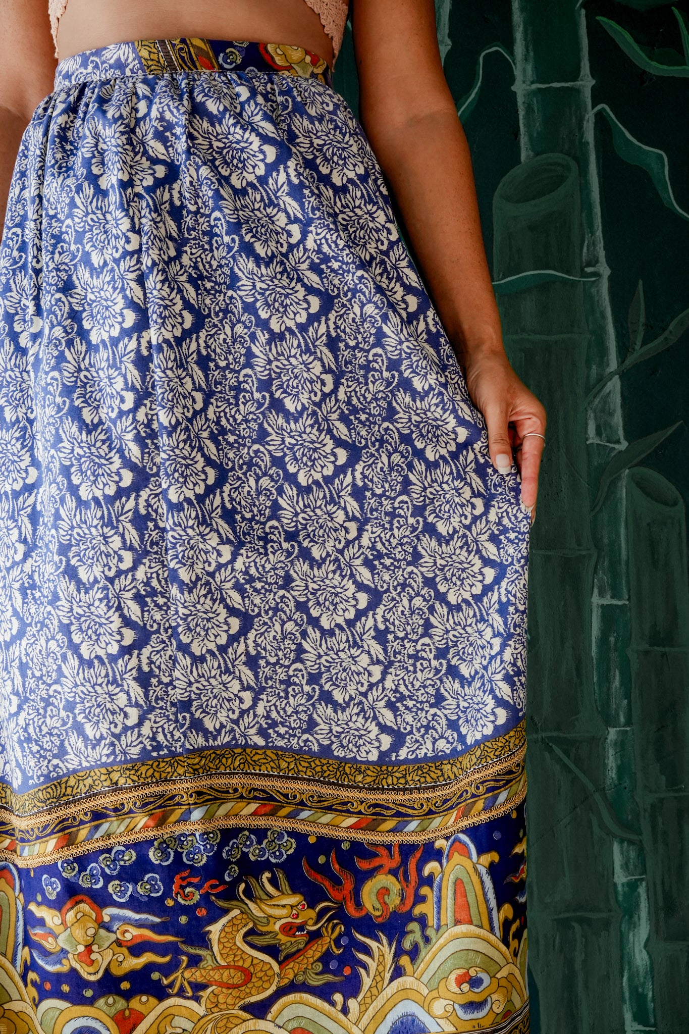 This 1960's high-waisted maxi skirt features a distinctive blue cotton fabric adorned with an intricate dragon print, reflecting authentic vintage style. Its flattering silhouette and breathable material make it a timeless piece for both comfort and standout fashion.