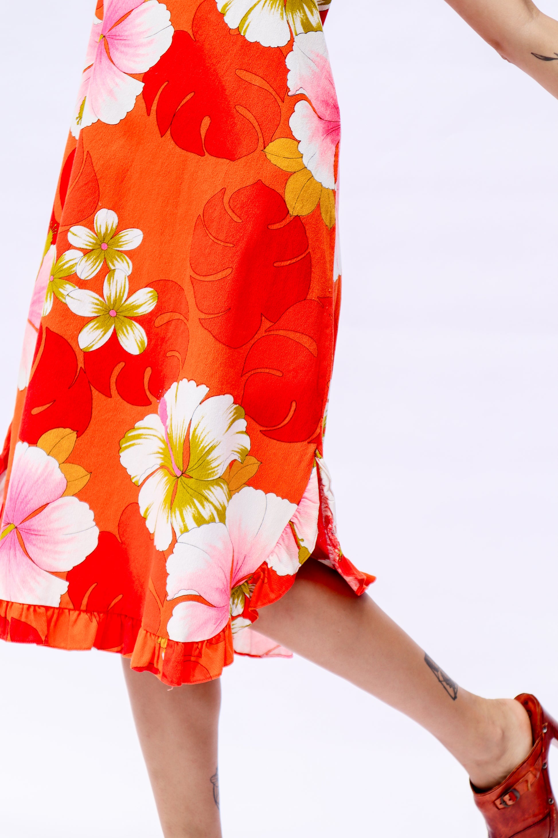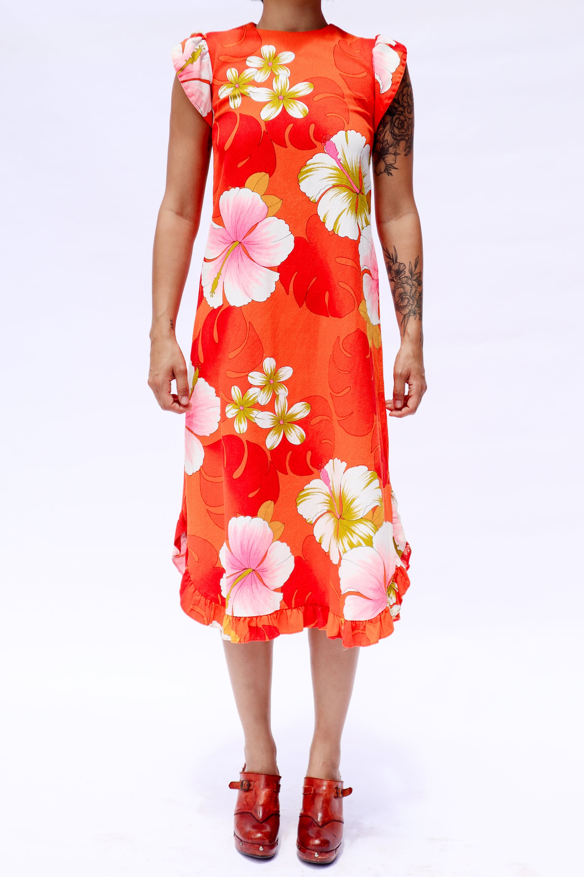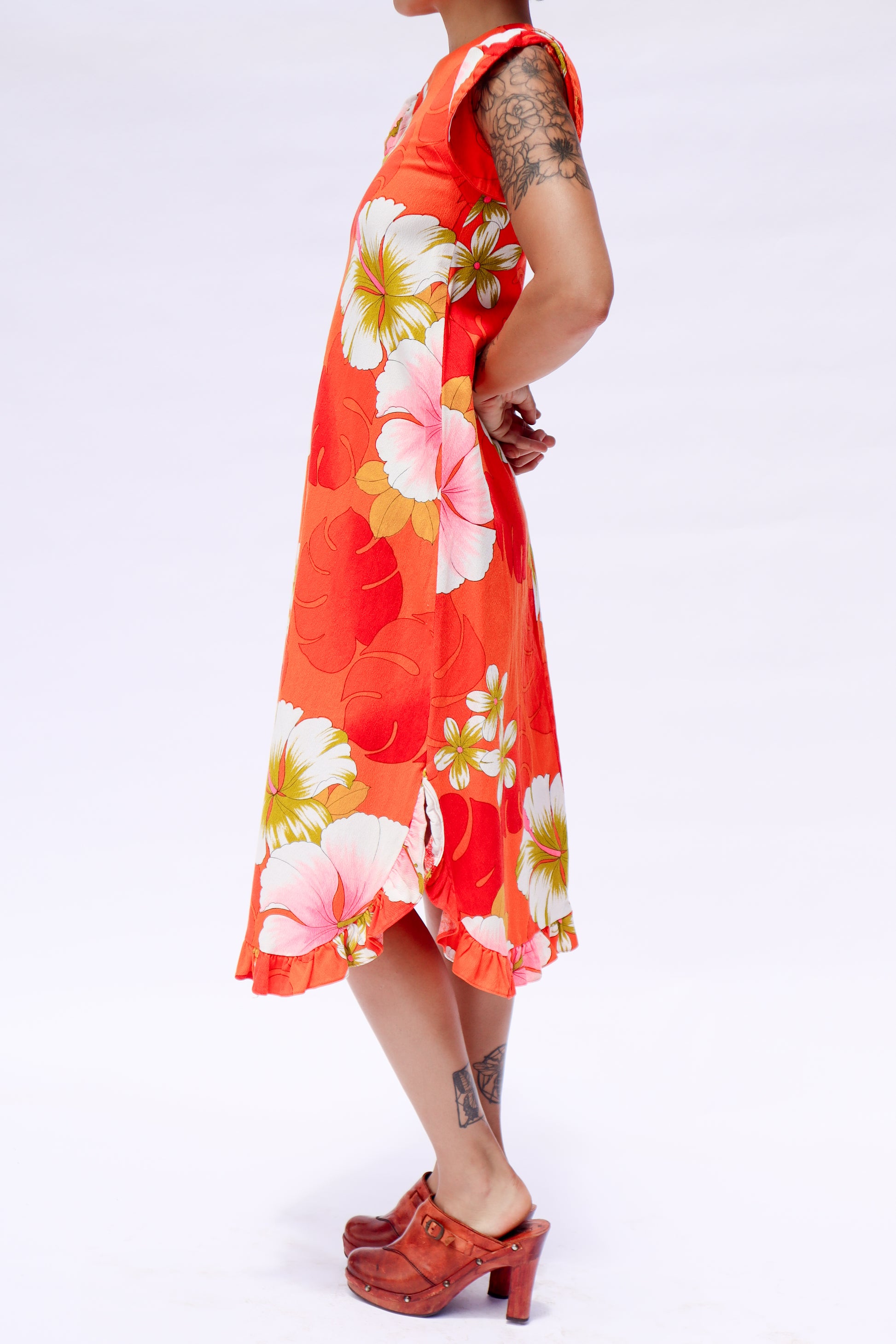 This 1960’s muumuu features a distinctive tropical psychedelic floral print on premium barkcloth, combining vintage style with durable, breathable fabric for authentic island comfort.