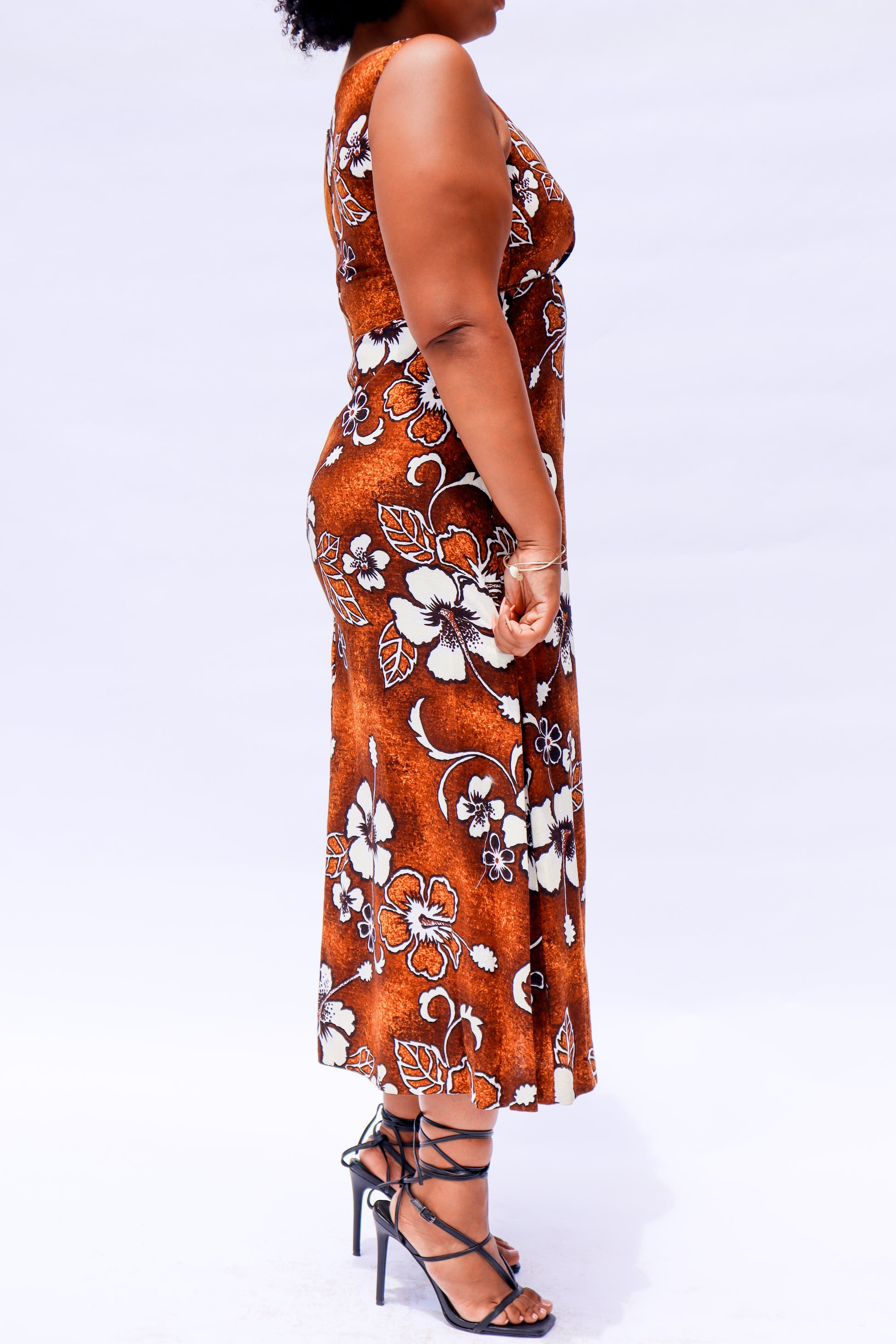 This 1960's barkcloth muumuu features a hibiscus print in rich brown and burnt orange tones, embodying classic Hawaiian style with vintage authenticity. Handmade, no tag.