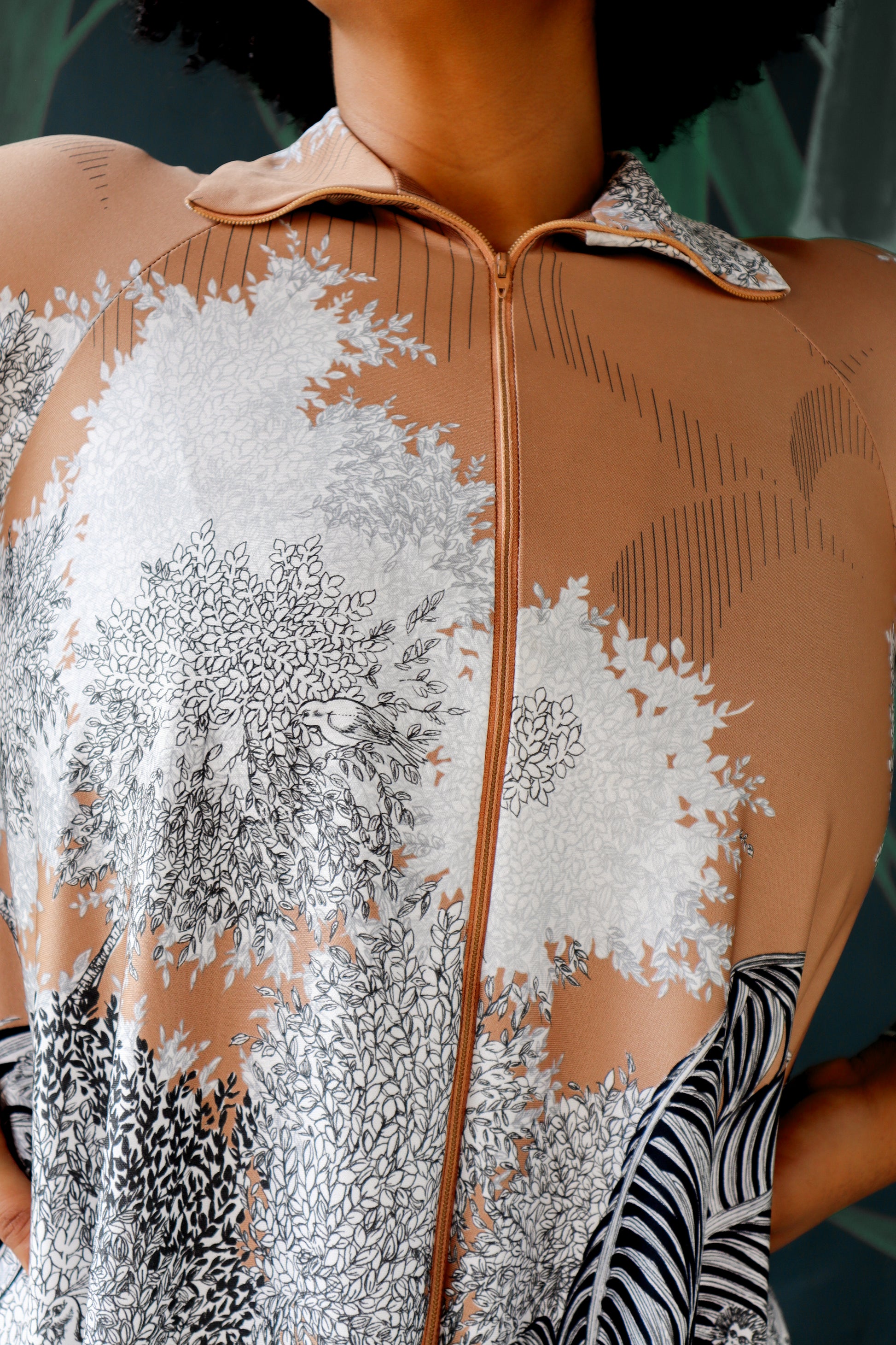 This 1960's Safari Kaftan is the perfect blend of style and comfort. With a stunning safari print and a convenient zip-up design, it's the ideal outfit for any adventure. Made with high-quality materials, this kaftan is not only fashionable, but also incredibly comfortable to wear. Elevate your wardrobe with this must-have piece.