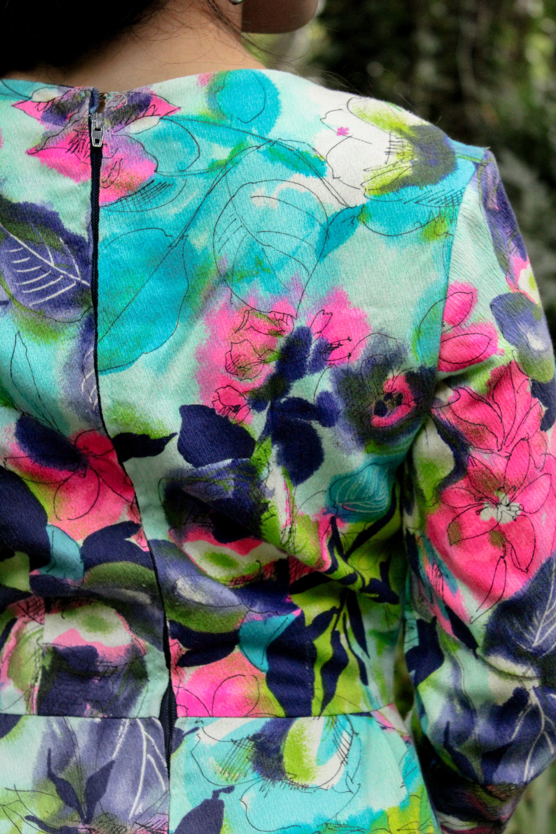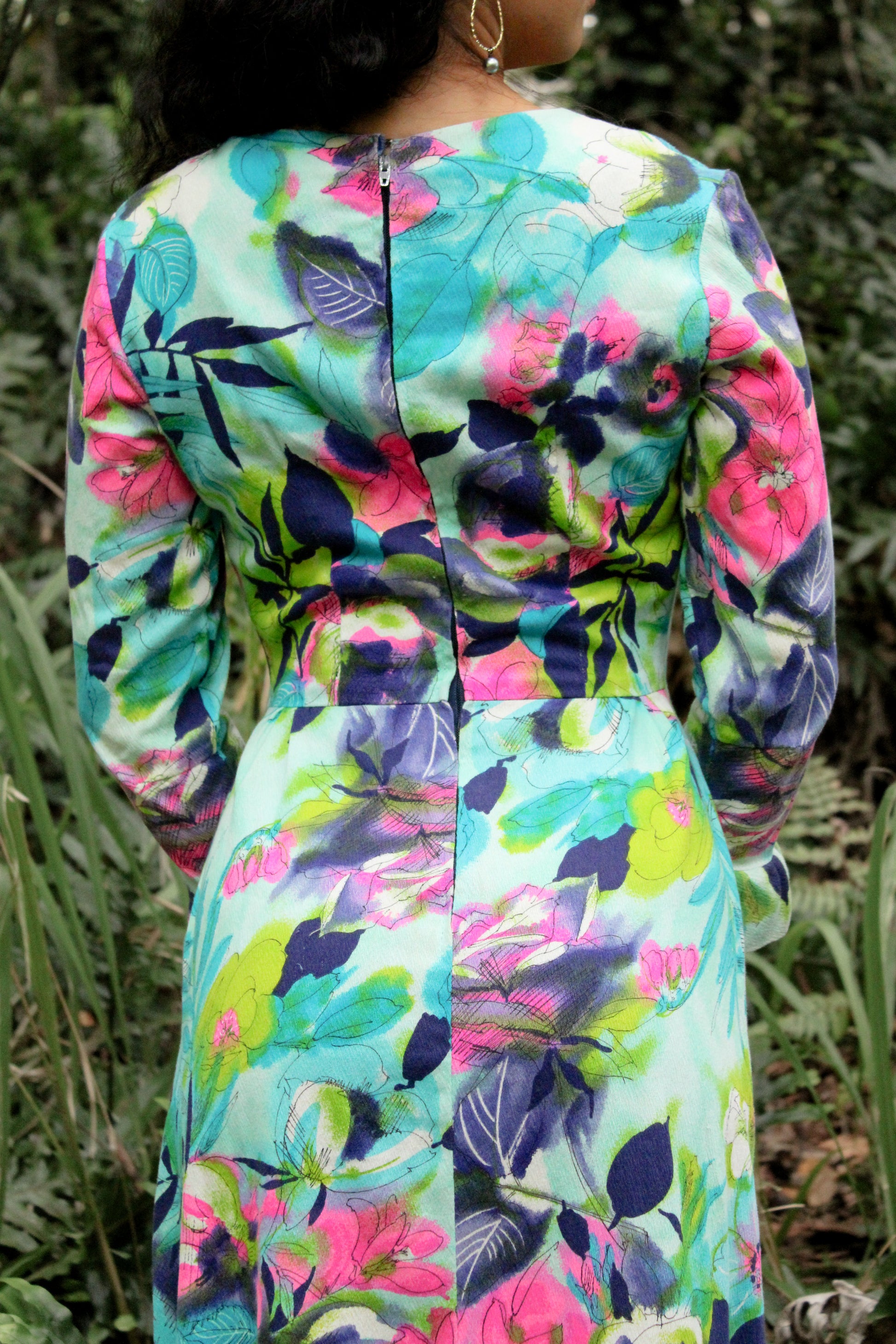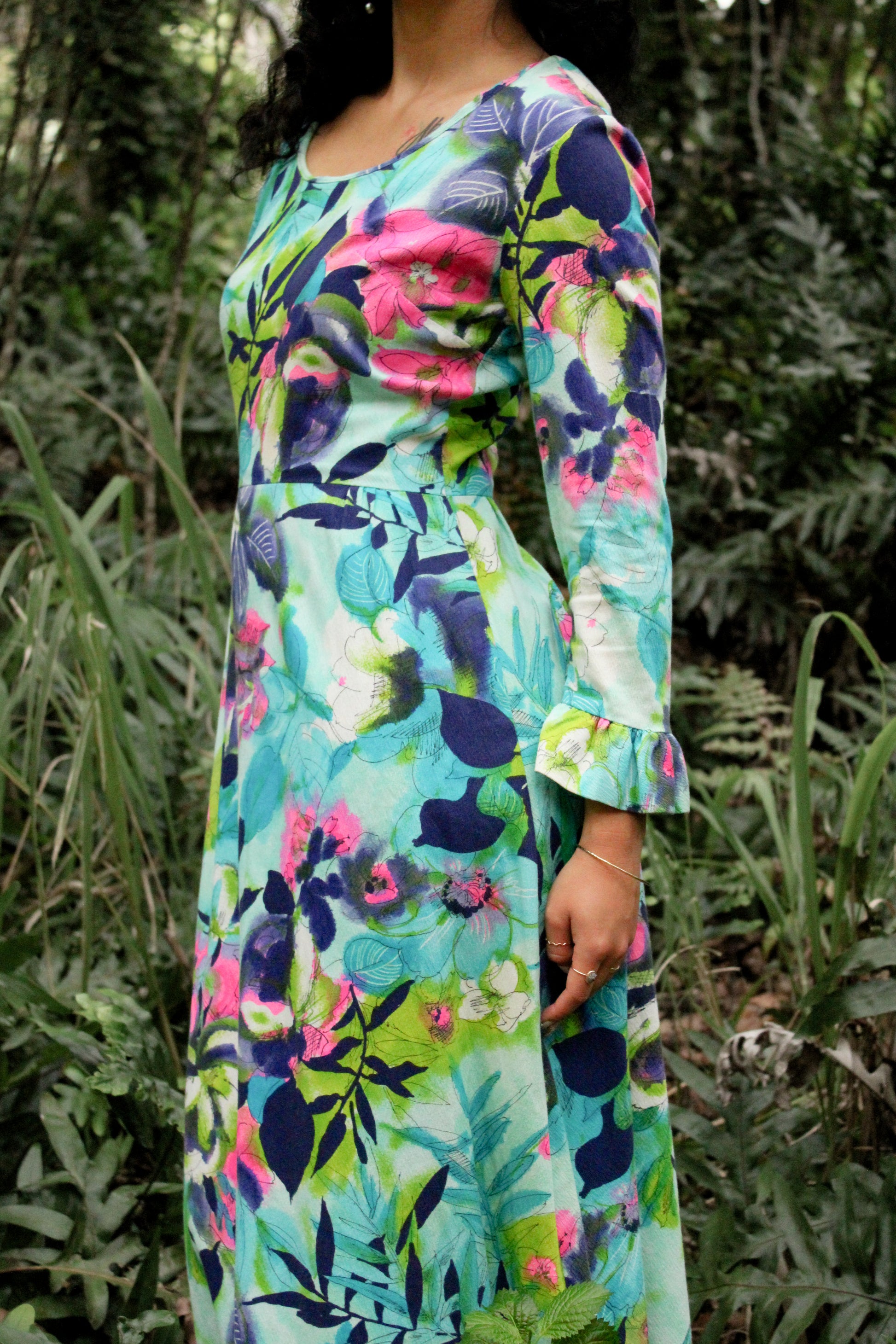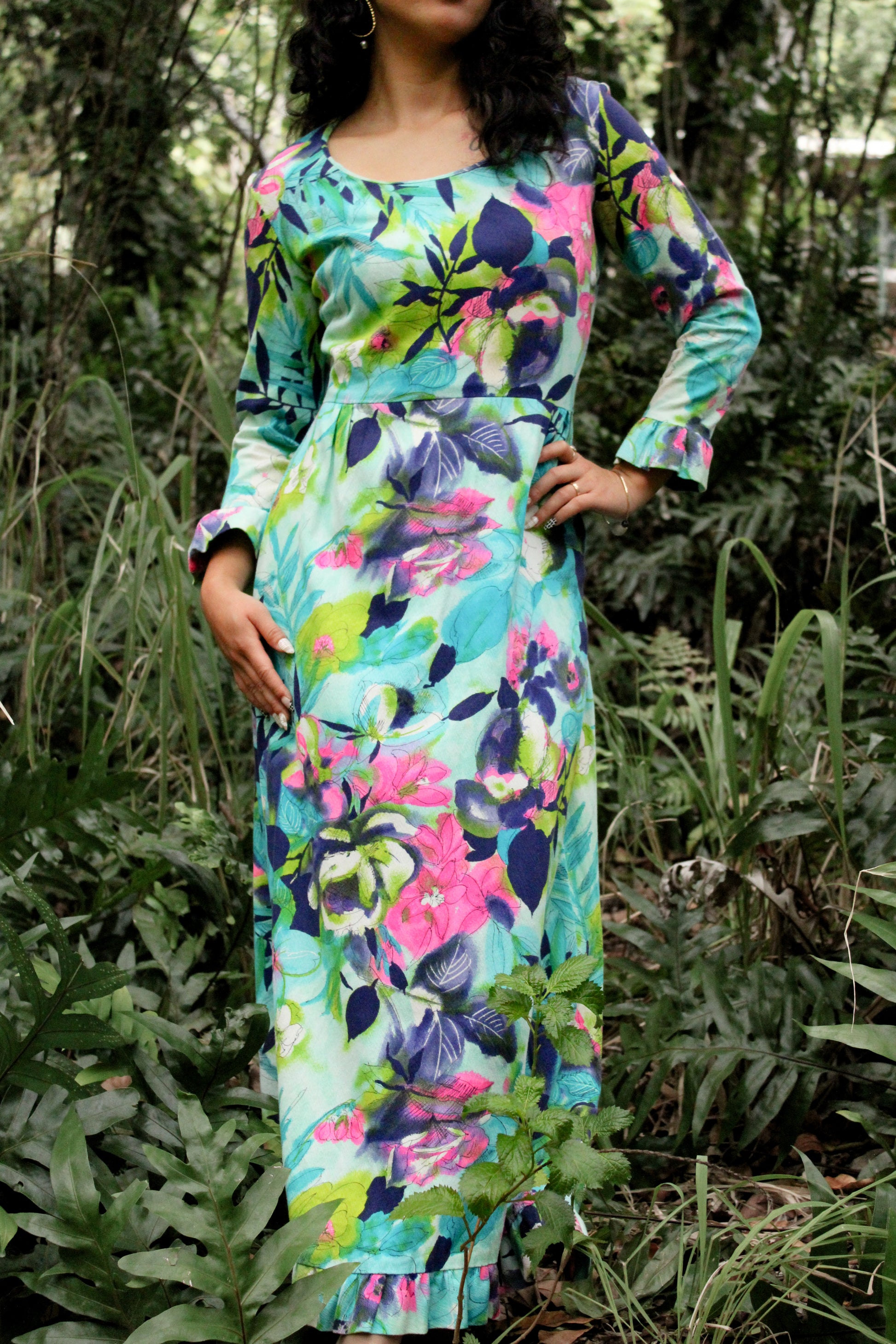 This 1970's Bohemian Liberty Circle Muʻumuʻu showcases a watercolor floral print in turquoise, pinks, and greens. Designed with a back zipper, it offers a comfortable vintage fit.