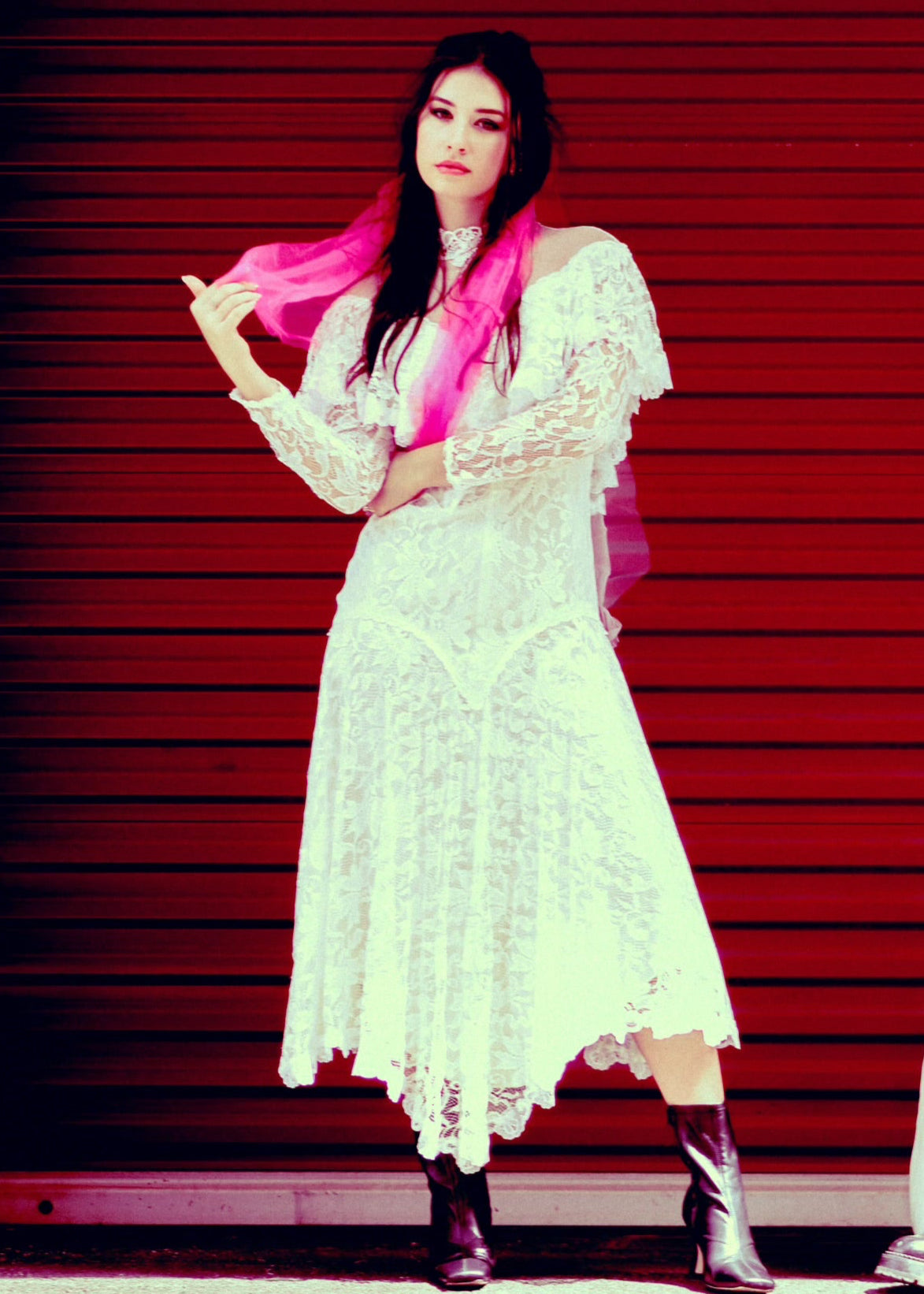 Experience the elegance and romance of a bygone era with our 1970's Bridal Dress. This exquisite lace gown features a high neckline and fitted bodice, giving off Victorian vibes. The flowy skirt adds a touch of whimsy. Perfect for your celebration of love. Model usually wears size Small.