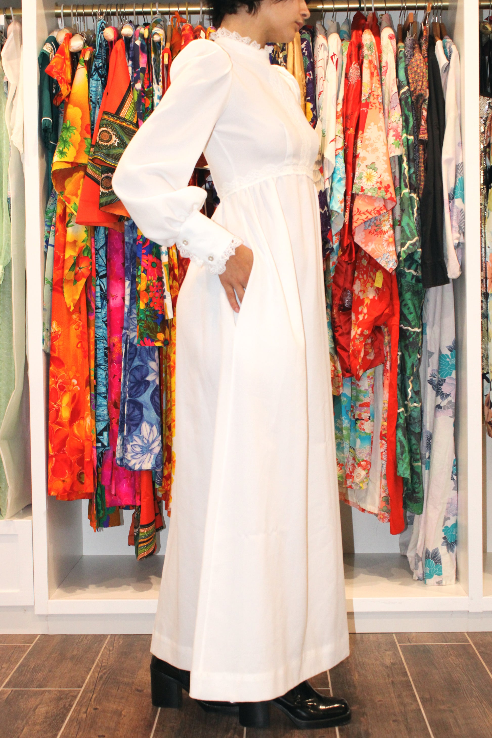 Details: 1970s maxi dress, empire waist, lantern sleeves, side pockets, cotton lace trim along neck & sleeve