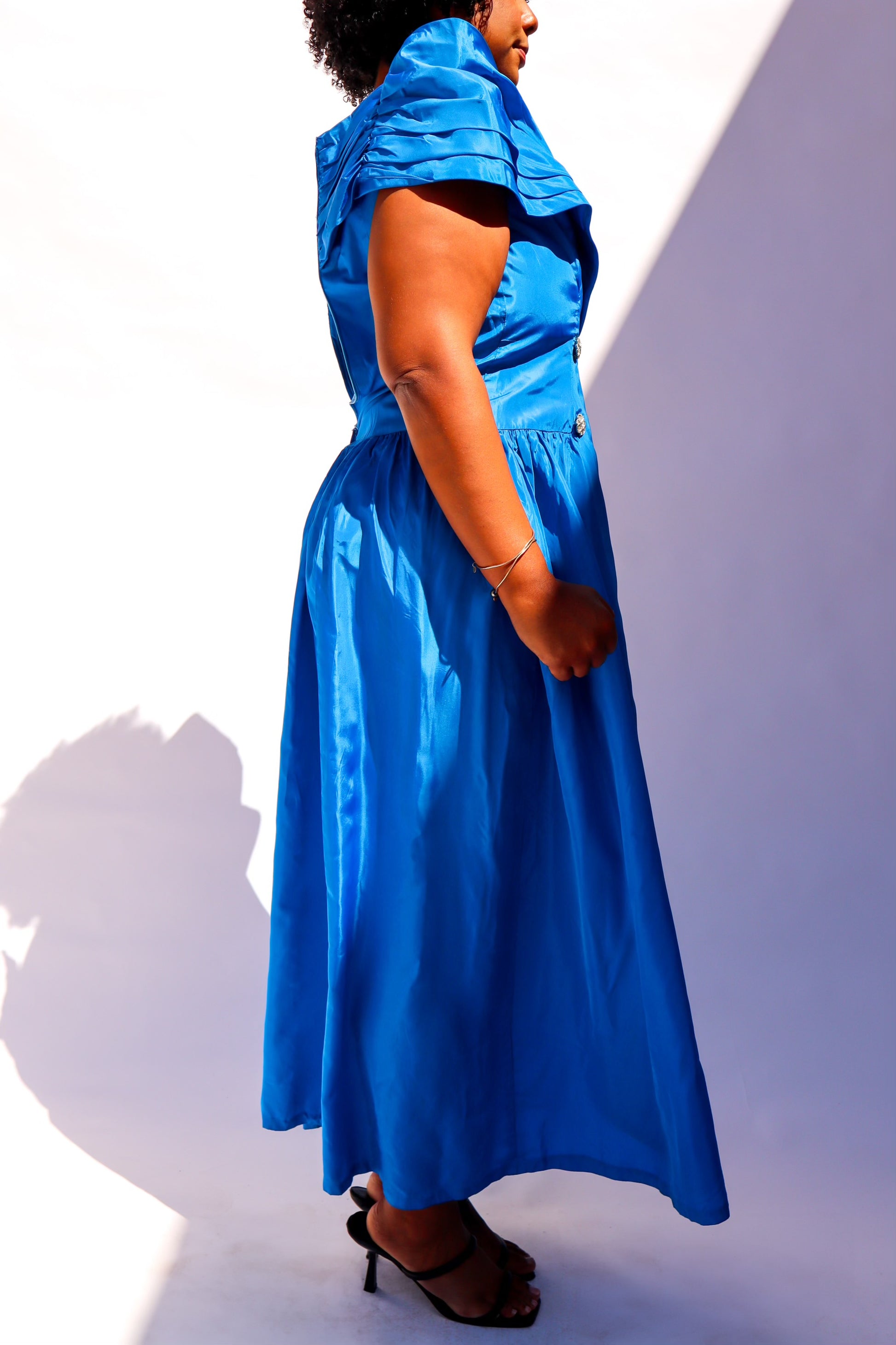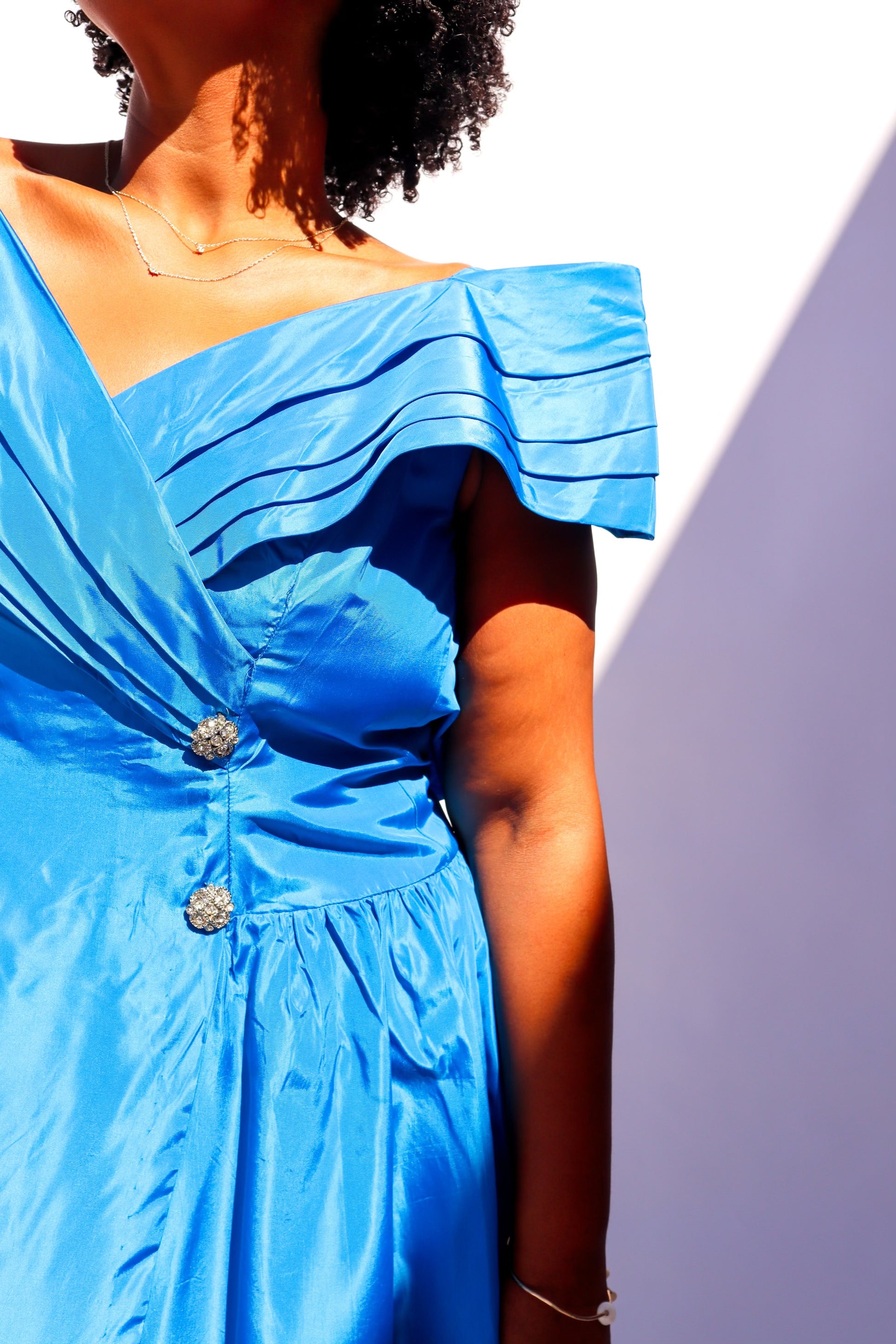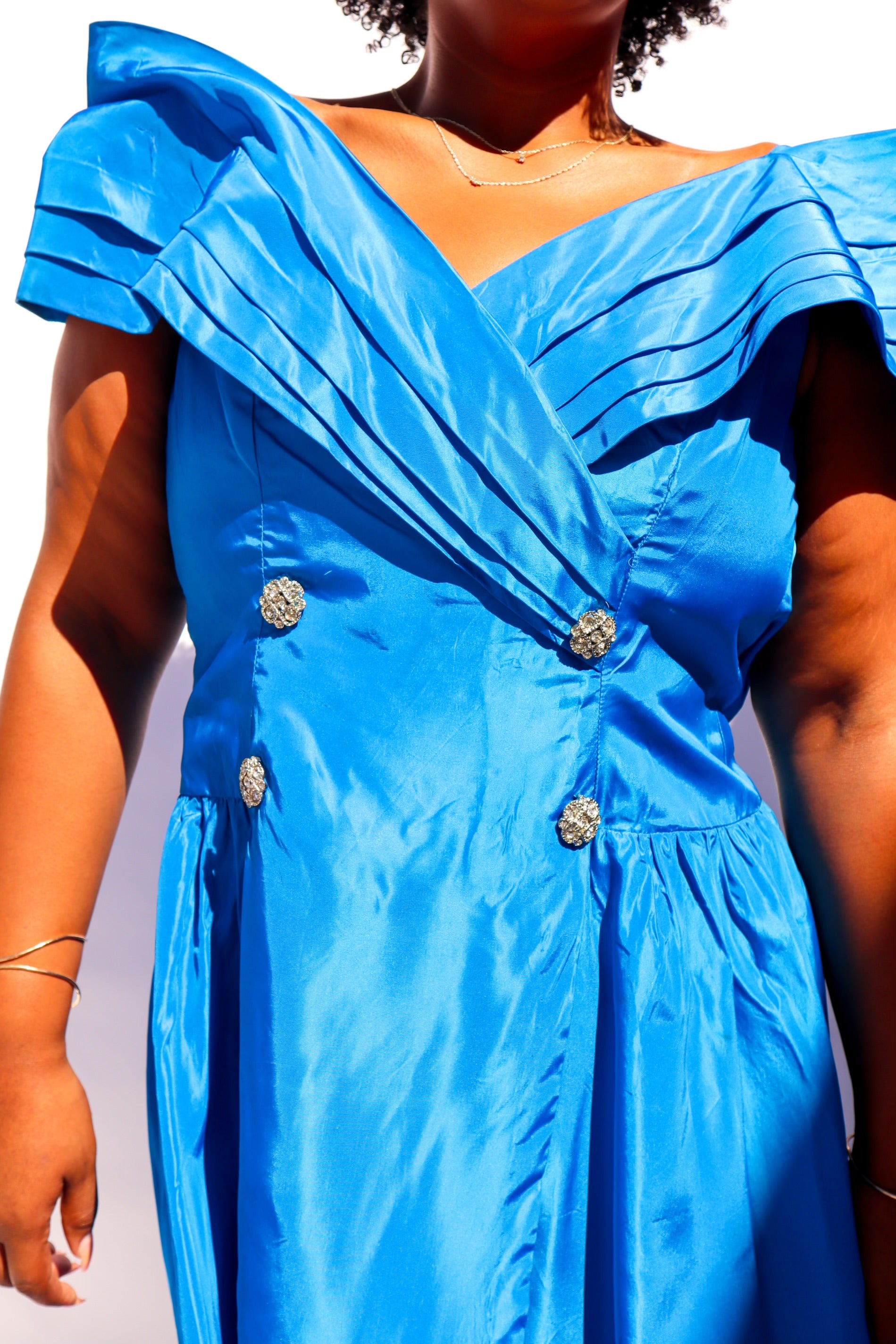 Embrace the allure of the 1980's with our vibrant blue taffeta off-the-shoulder gown. Its dramatic neckline adds a touch of glamour and elegance, making you the center of attention. Perfect for special occasions where you want to make a statement.