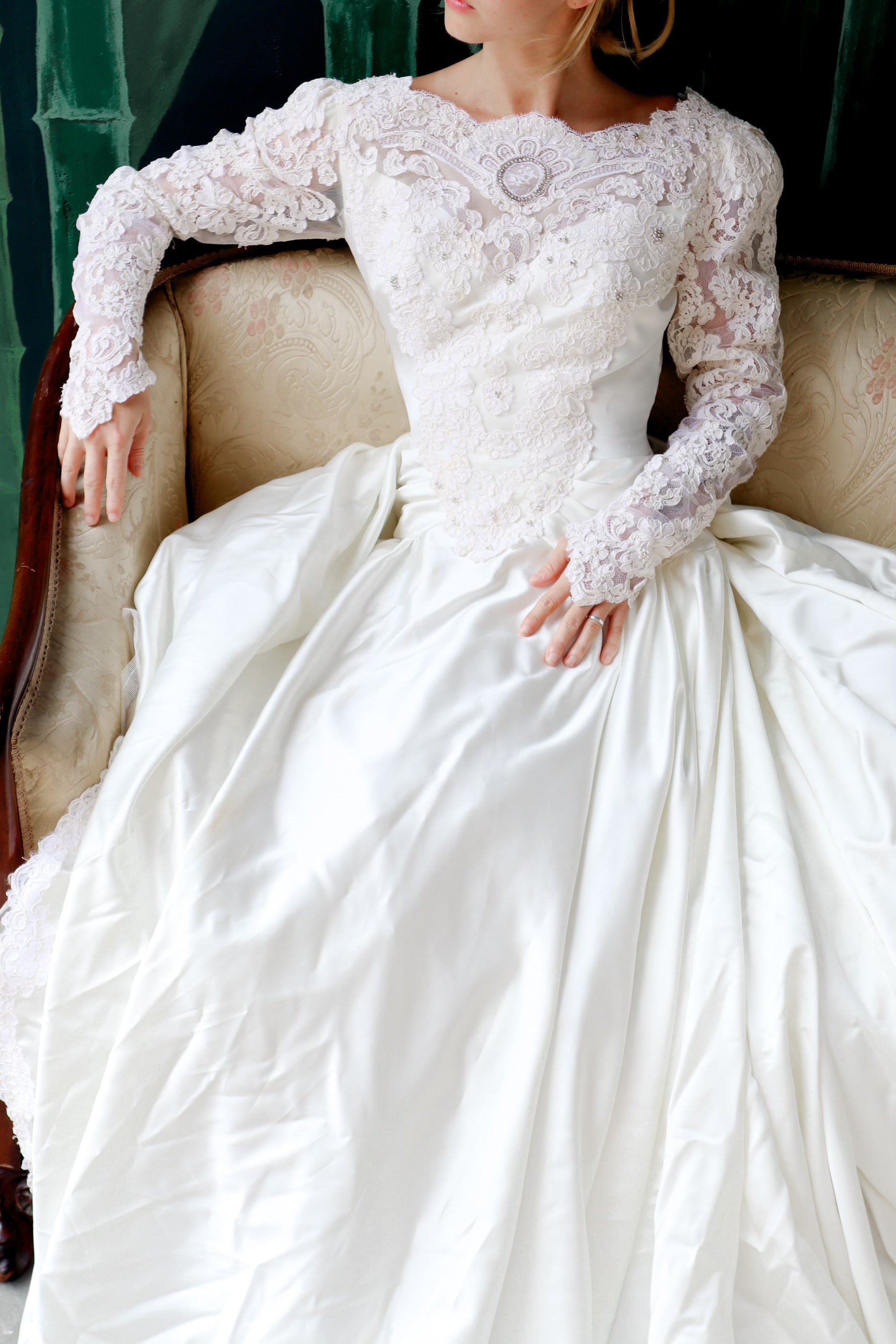 This vintage bridal gown from the 1980s features a beautifully detailed bodice with long lace sleeves and delicate beaded embroidery. Flattering buttoned up back. The elegant design adds a touch of sophistication to any wedding, making the bride feel like a princess. Bring a touch of vintage charm to your special day with this exquisite dress.