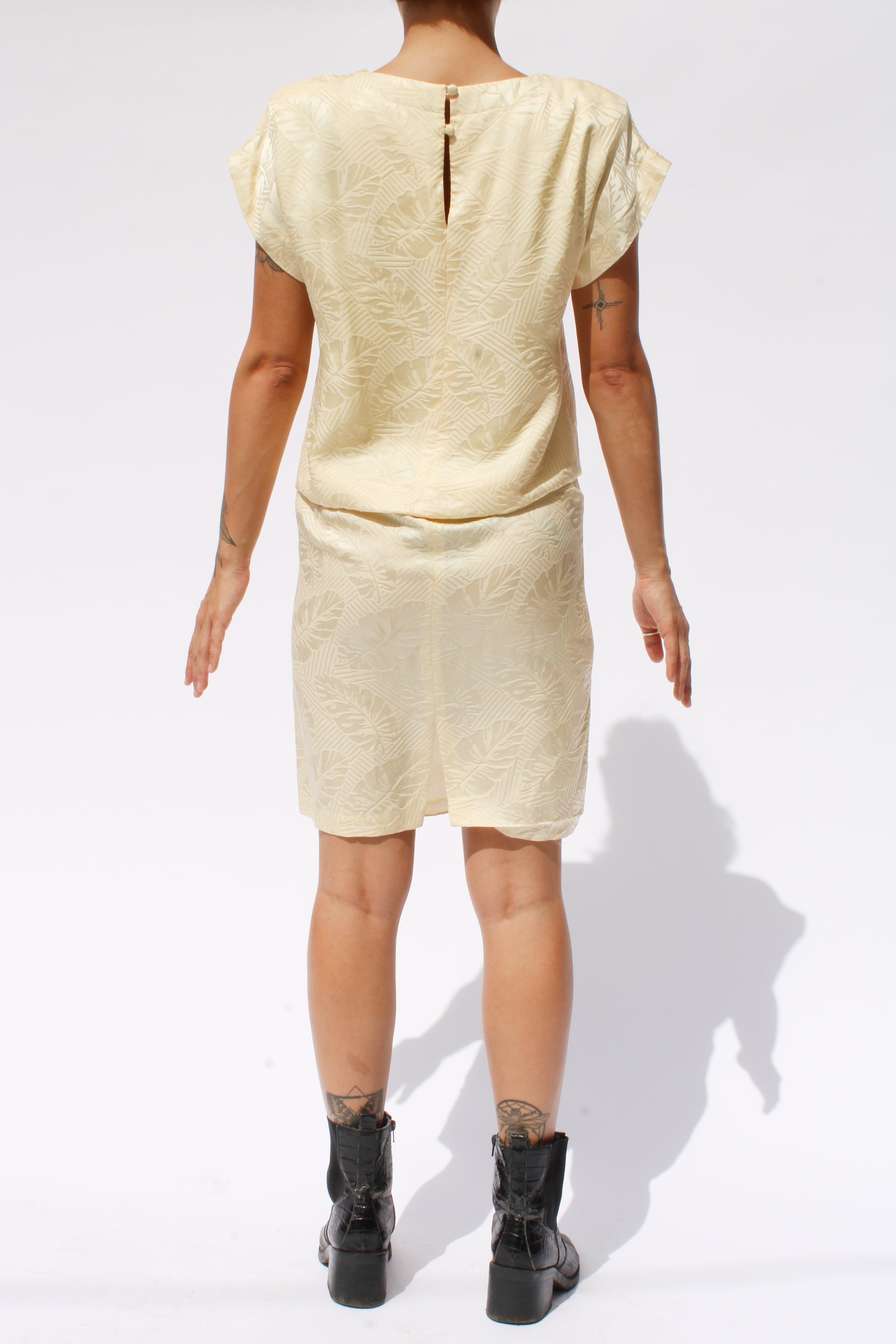 1980s Buttercream Leaf Damask Print Silk Mini Dress