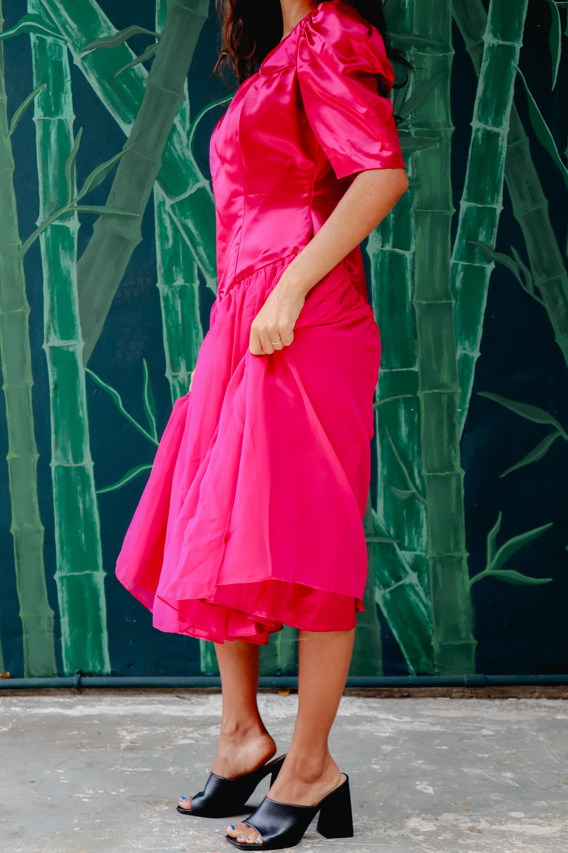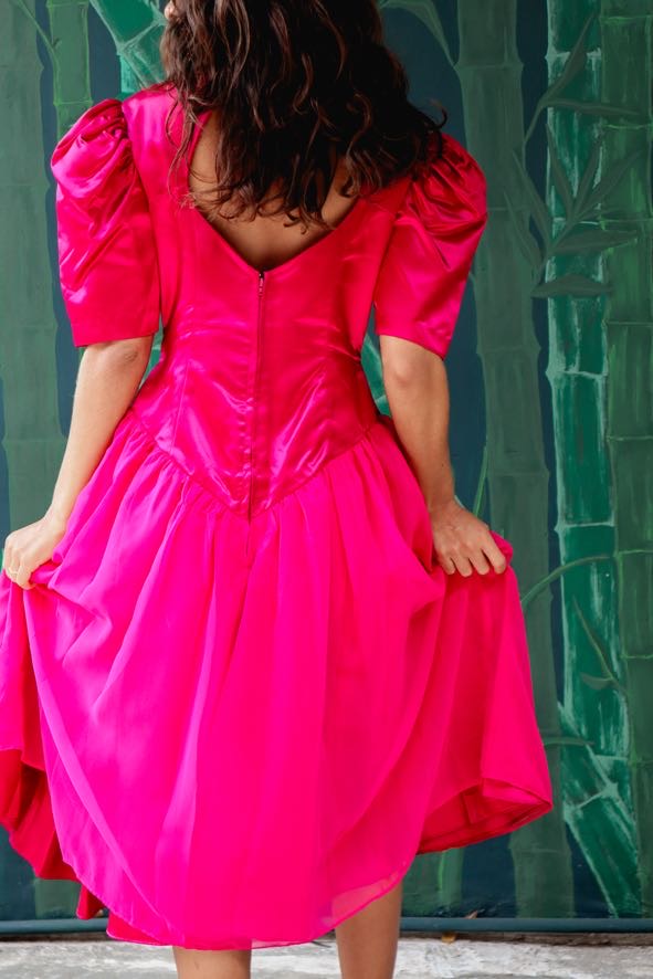 This handmade 1980s pink party dress features a playful bust cut-out, exaggerated sleeves, and a flattering V-shaped waistline to highlight your figure with confidence.
