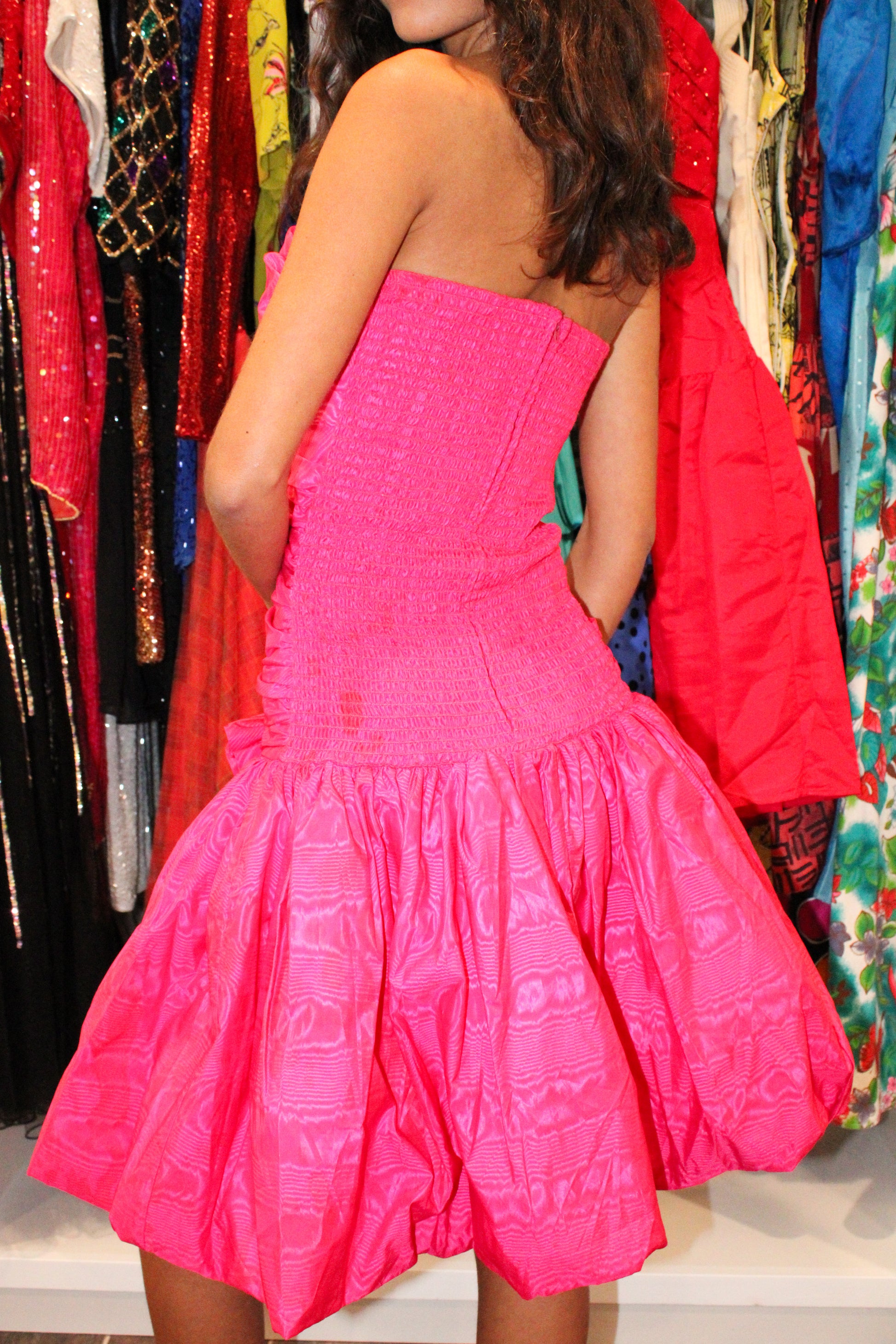 Add a pop of color and retro flair to your wardrobe with our 1980s Fuscia Rouched Strapless Bubble Dress. Perfect for any occasion, this dress features a flattering rouched design and a bubbly skirt that will make you stand out in a crowd. Bring back the vintage vibes and feel confident and stylish in this dress.