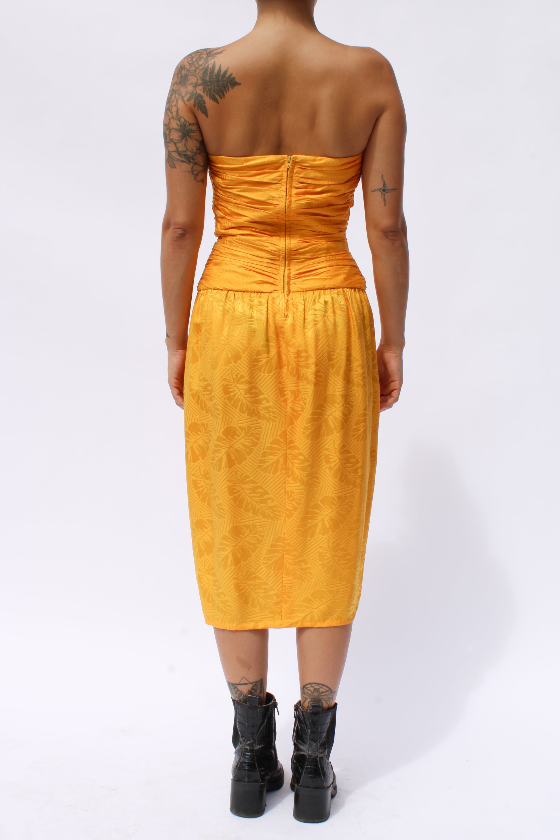 1980s Goldenrod Damask Sweetheart Sleeveless Midi Dress