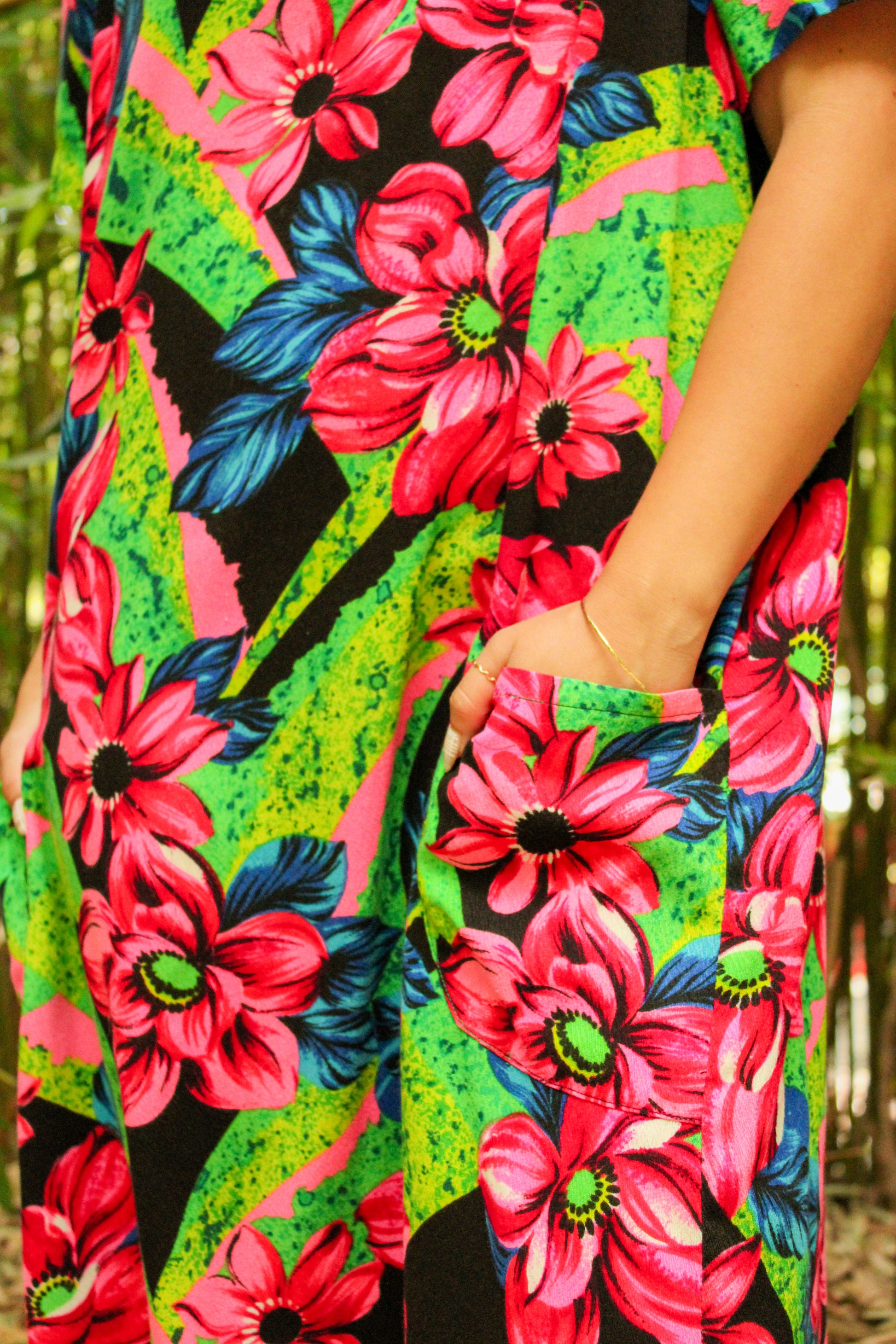 Brighten your day with this playful 1980s muʻumuʻu, featuring bold neon florals, two front pockets, airy sleeves, and a cozy, comfy fit.