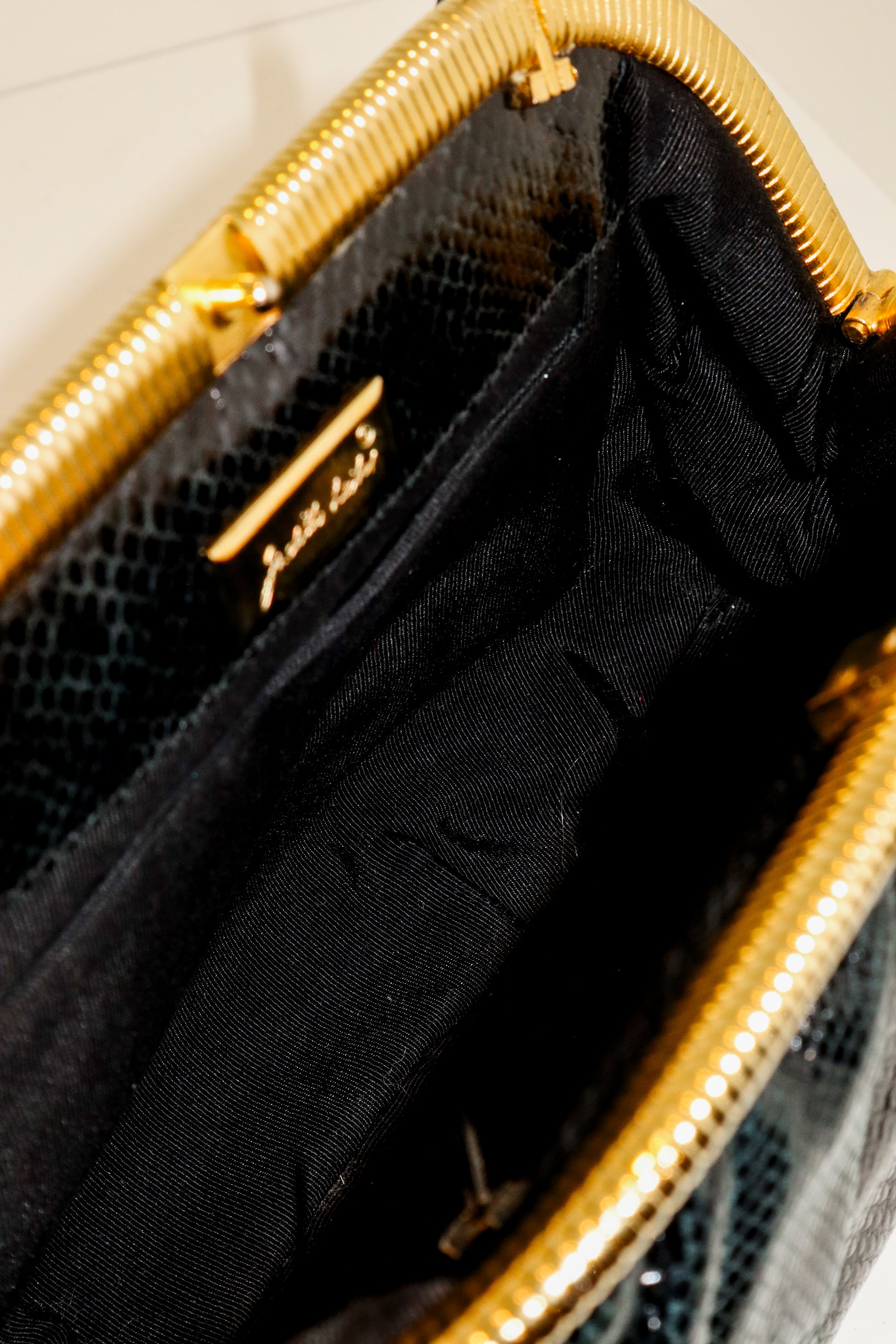 Vintage Judith Leiber black pleated lizard leather exterior trimmed with gold hardware and unique lion head embossed center detail.