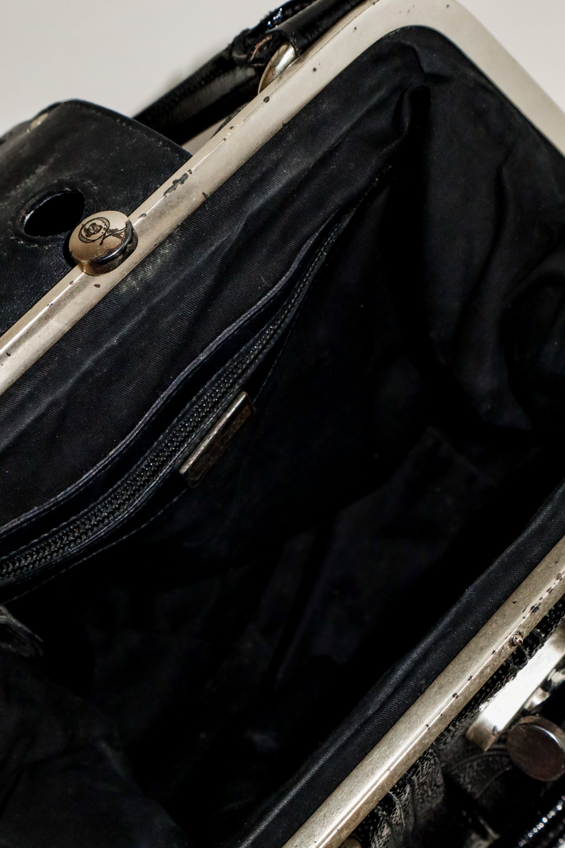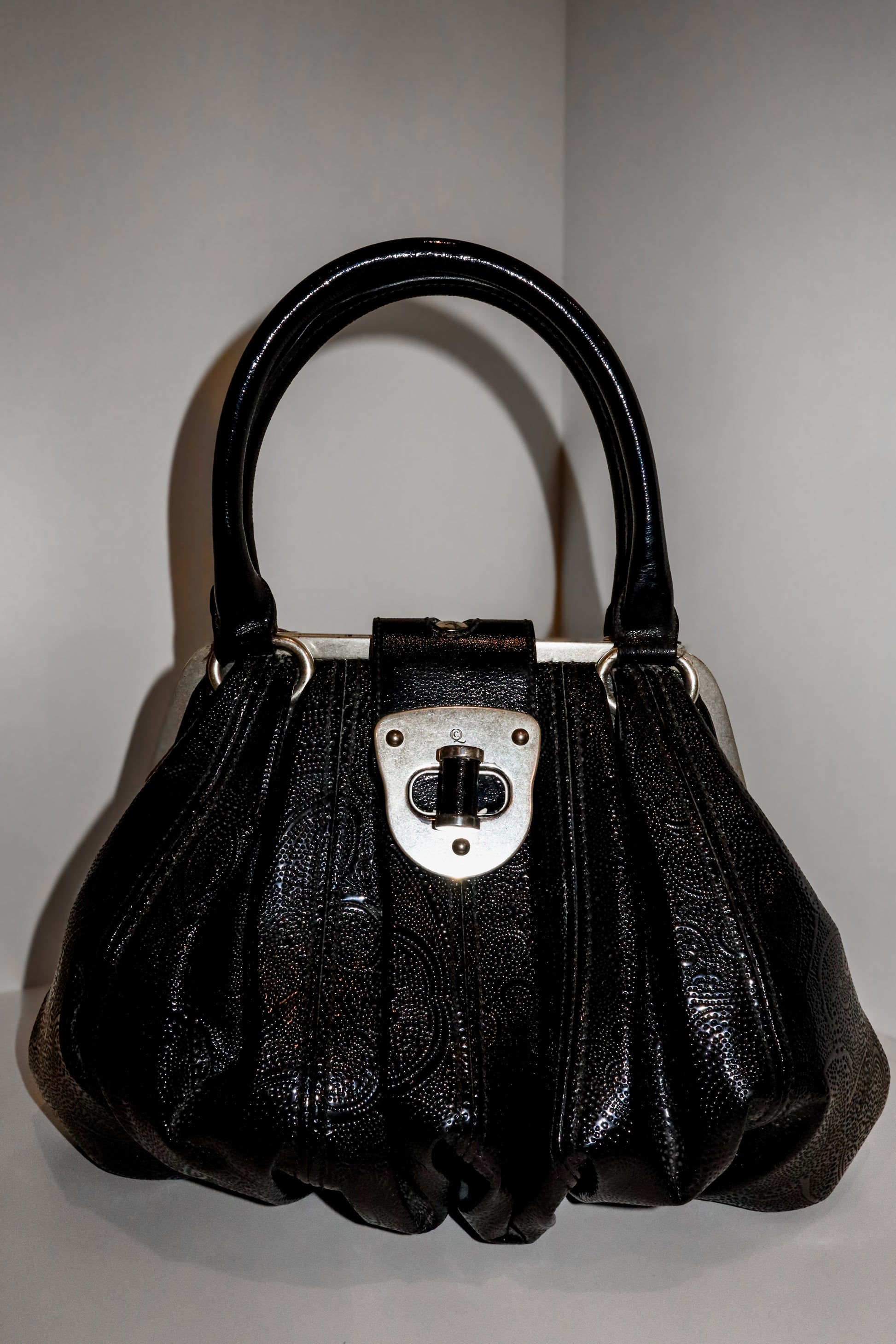 Novak Satchel: This limited-edition bag features a paisley print in black and silver, is made of patent leather, and is described as being in excellent condition with some tarnishing on the hardware. It has double rolled handles and measures: