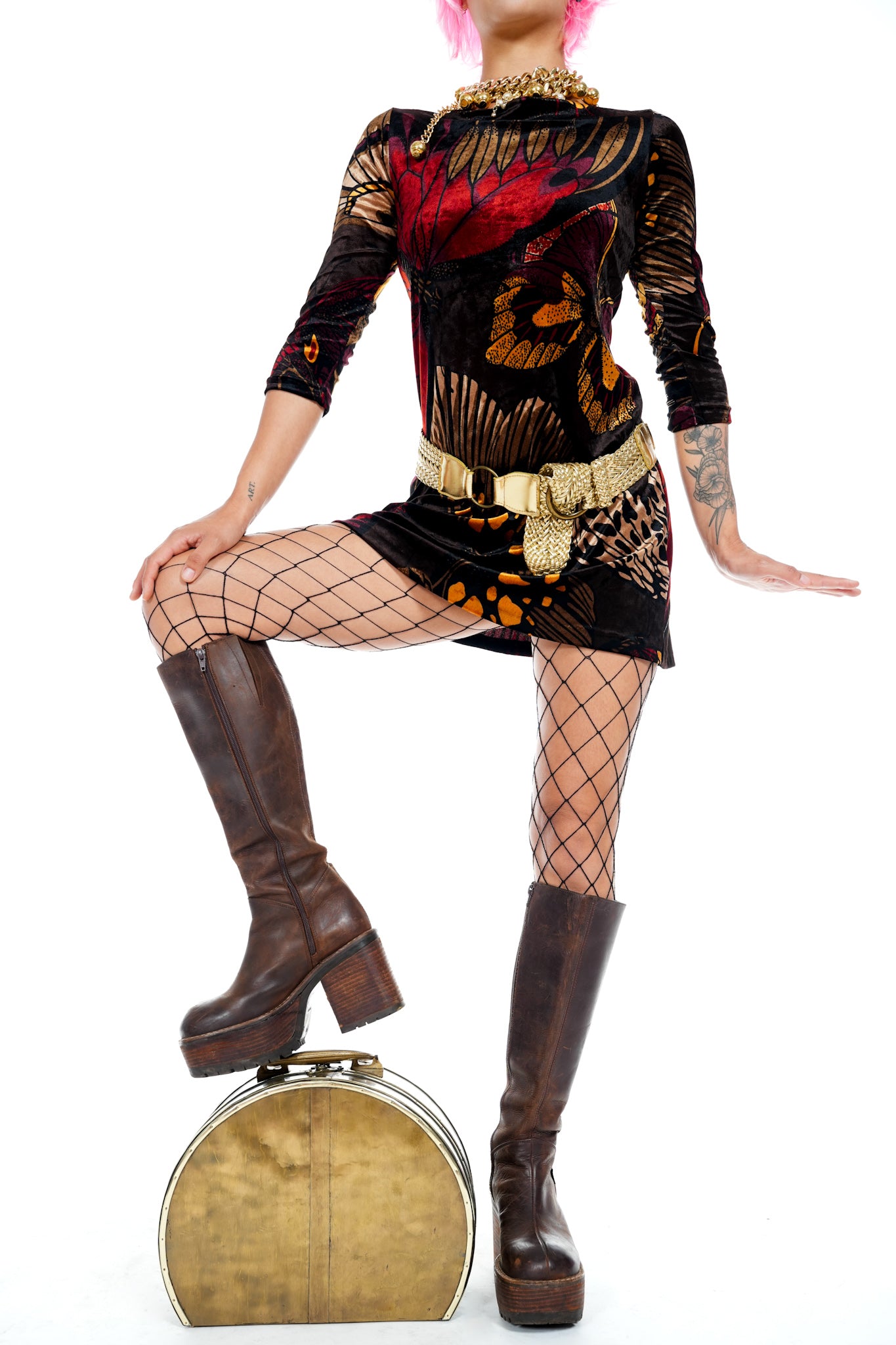 This 1990's Betsey Johnson mini dress features a soft velvet exterior adorned with charming butterfly prints, adding a whimsical touch to your wardrobe. With its playful 3/4 sleeves, it’s perfect for dancing through any day with vintage flair.