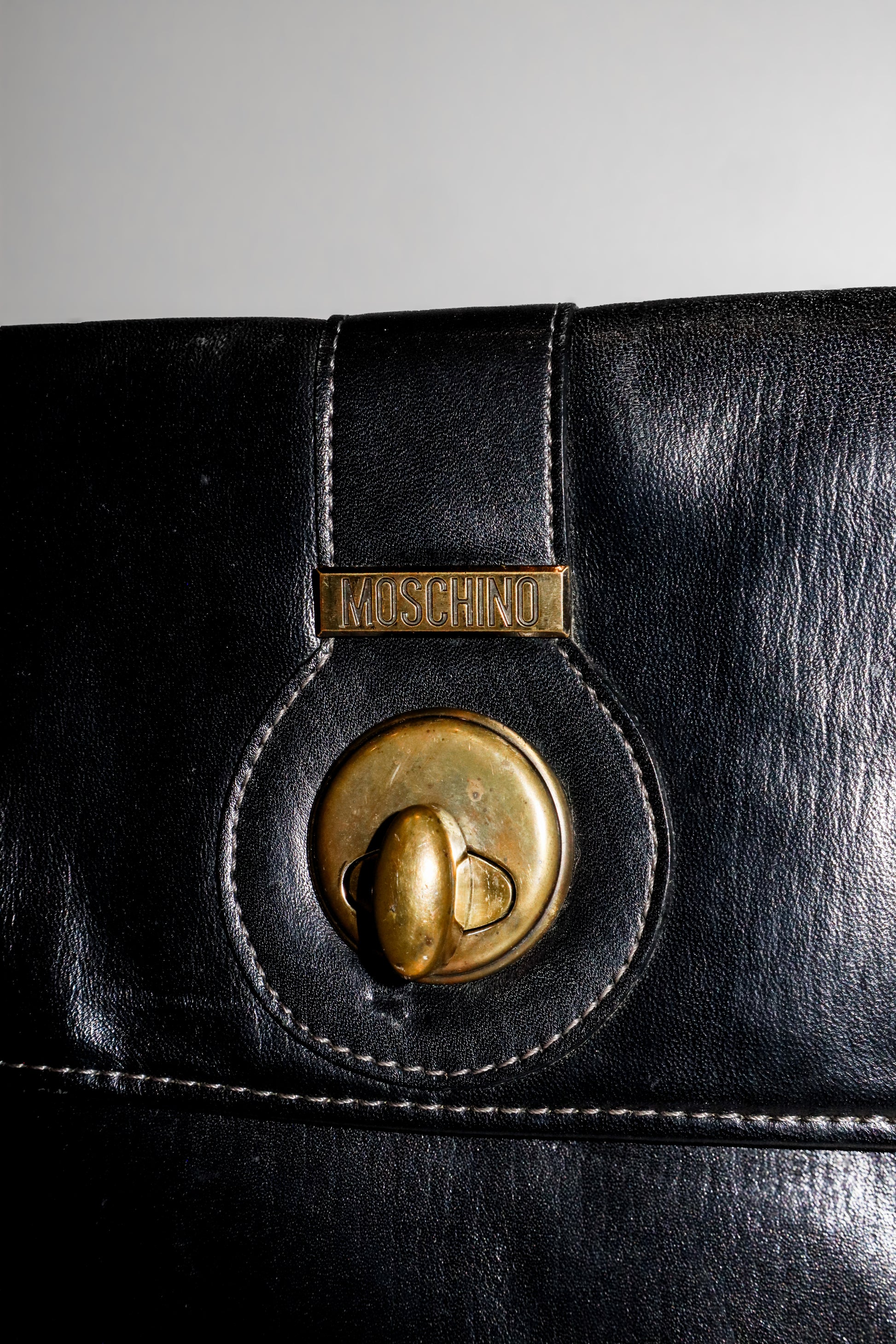 This 1990's Moschino clutch features soft black leather, elegant gold hardware, and a clean interior for a refined, classic look.