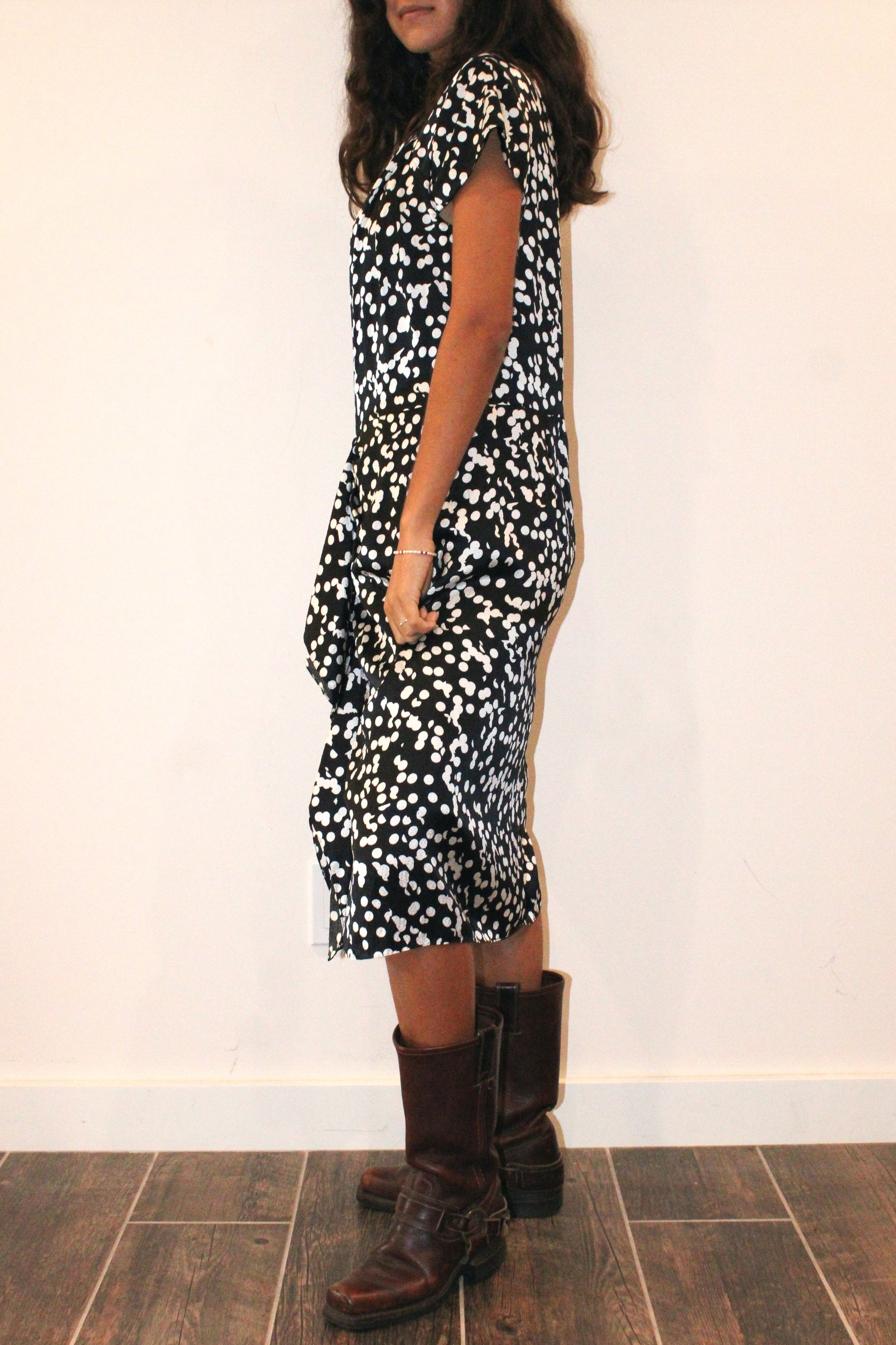Twirl into the 1990s with this silk navy polka dot dress! The classic polka dots add a dash of retro charm, while the luxurious silk feels like a dream. Whether you're sipping on a latte or strolling through a vintage market, this dress is all about effortless elegance. Ready to make very moment feel like a fashion forward throwback!