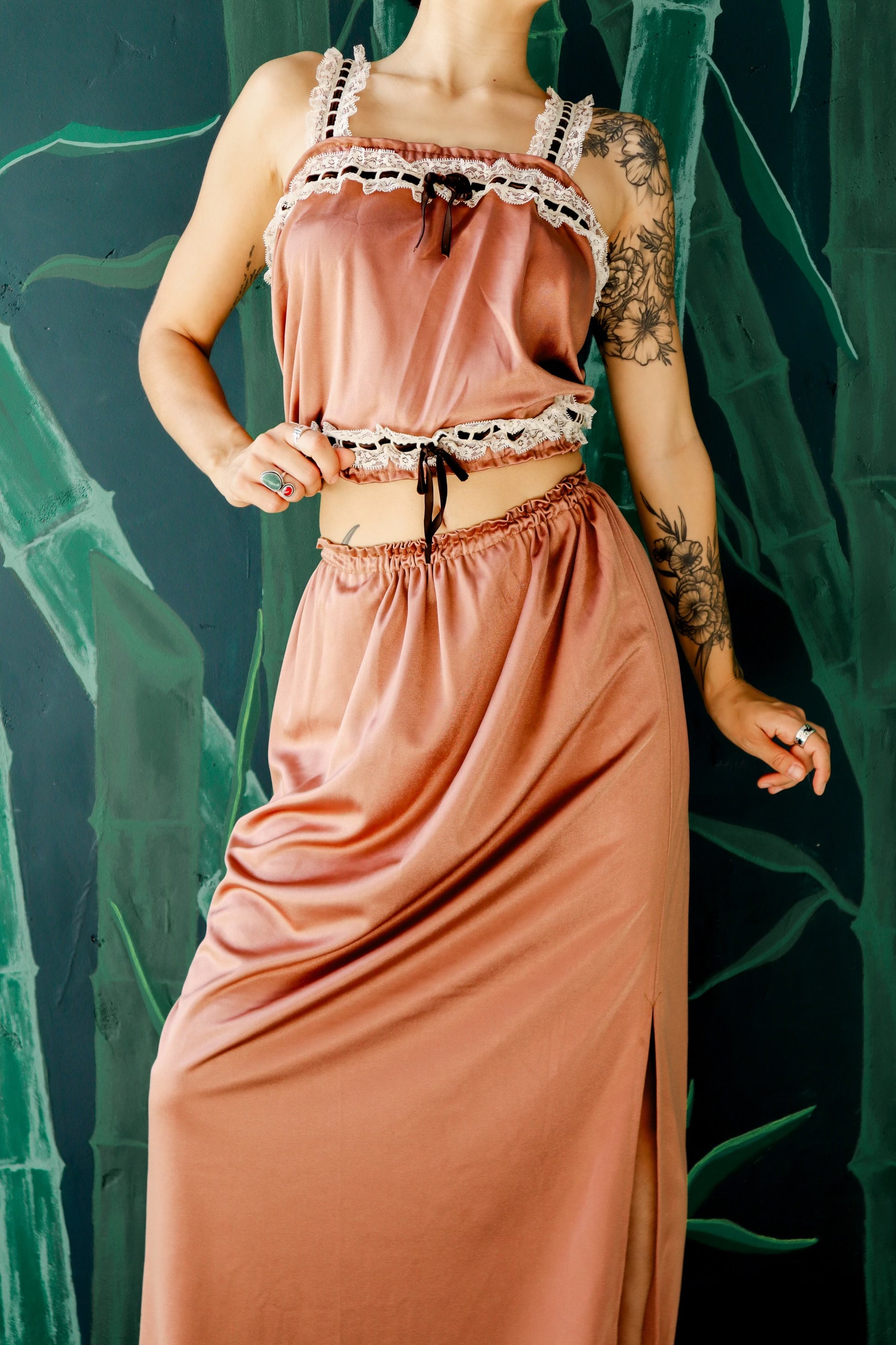 This handmade brown satin set combines silky smooth comfort with playful lace details on the top for a flirty finish. Perfect for adding a touch of fun and elegance to your loungewear collection.
