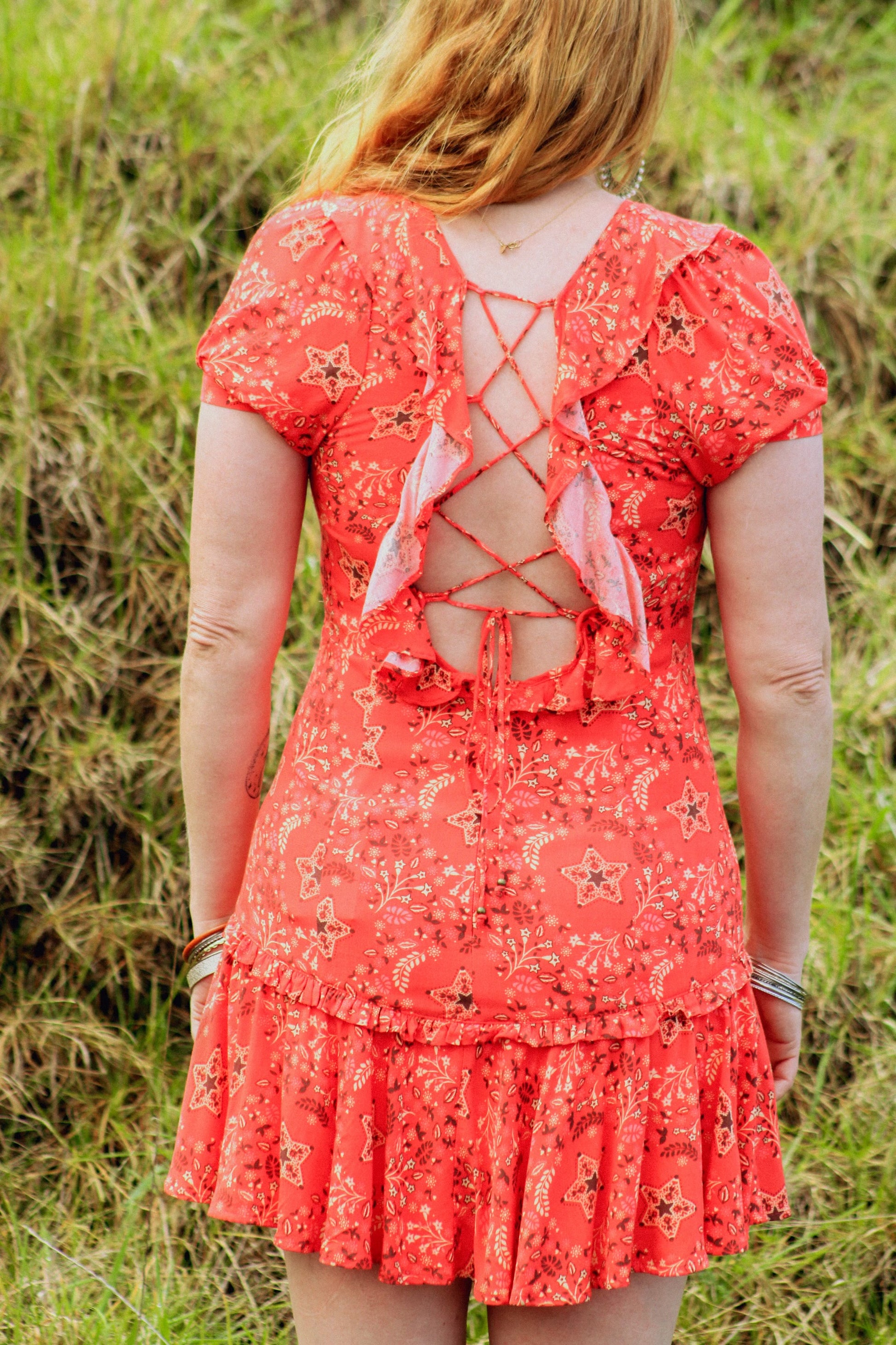 Indulge in the ultimate flirty and bold look with our Celestial Mini Dress. This fitted yet flowy dress boasts a low scoop neckline, a lace-up back, and a perfectly ruffled hem. Fits true to size.