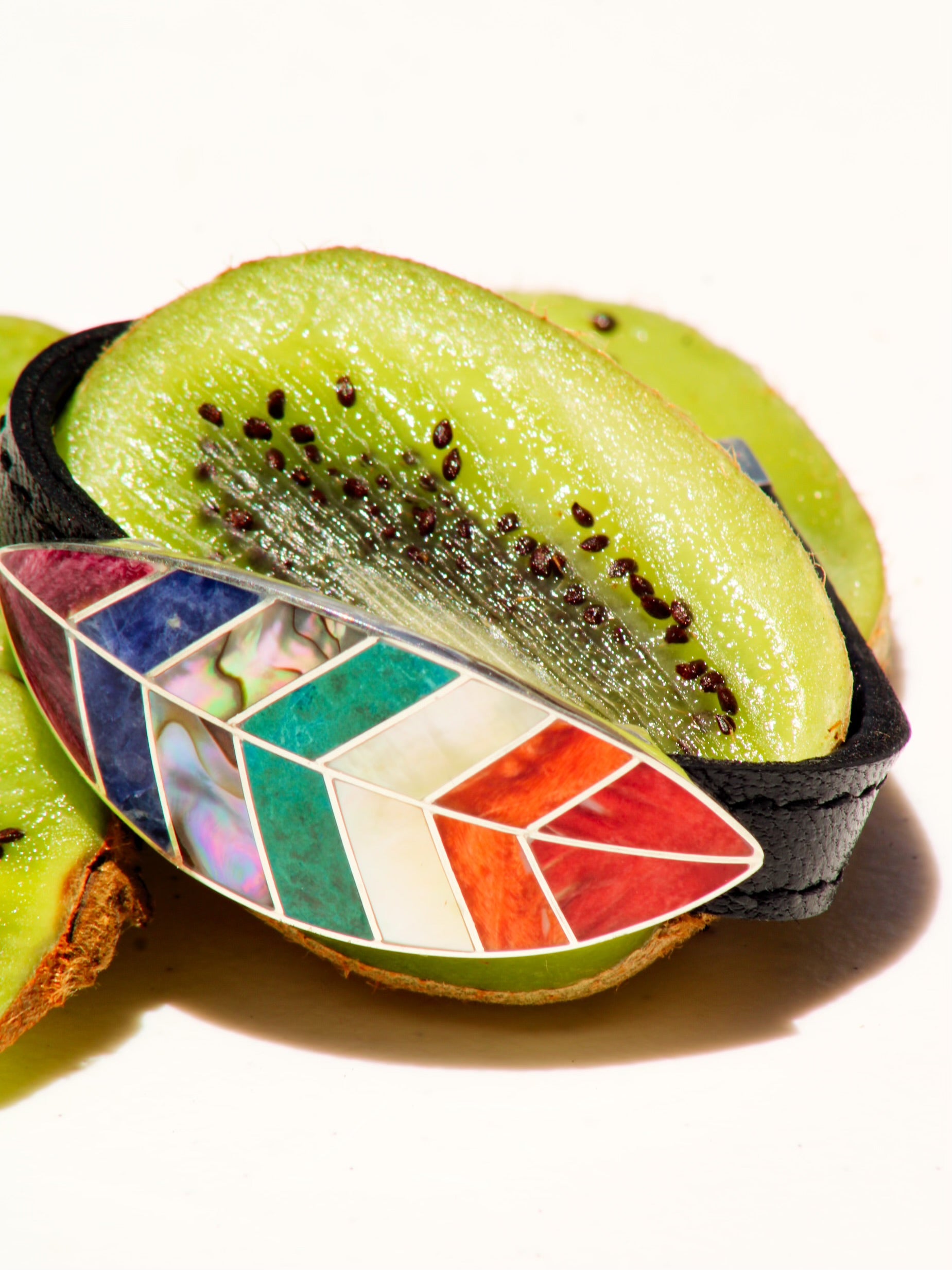 Wrapped in refined elegance, our Leather and Sterling Silver Rainbow Bracelet. Handmade, showcasing a distinctive Peruvian cocoa leaf design crafted from luminous rainbow gemstones.