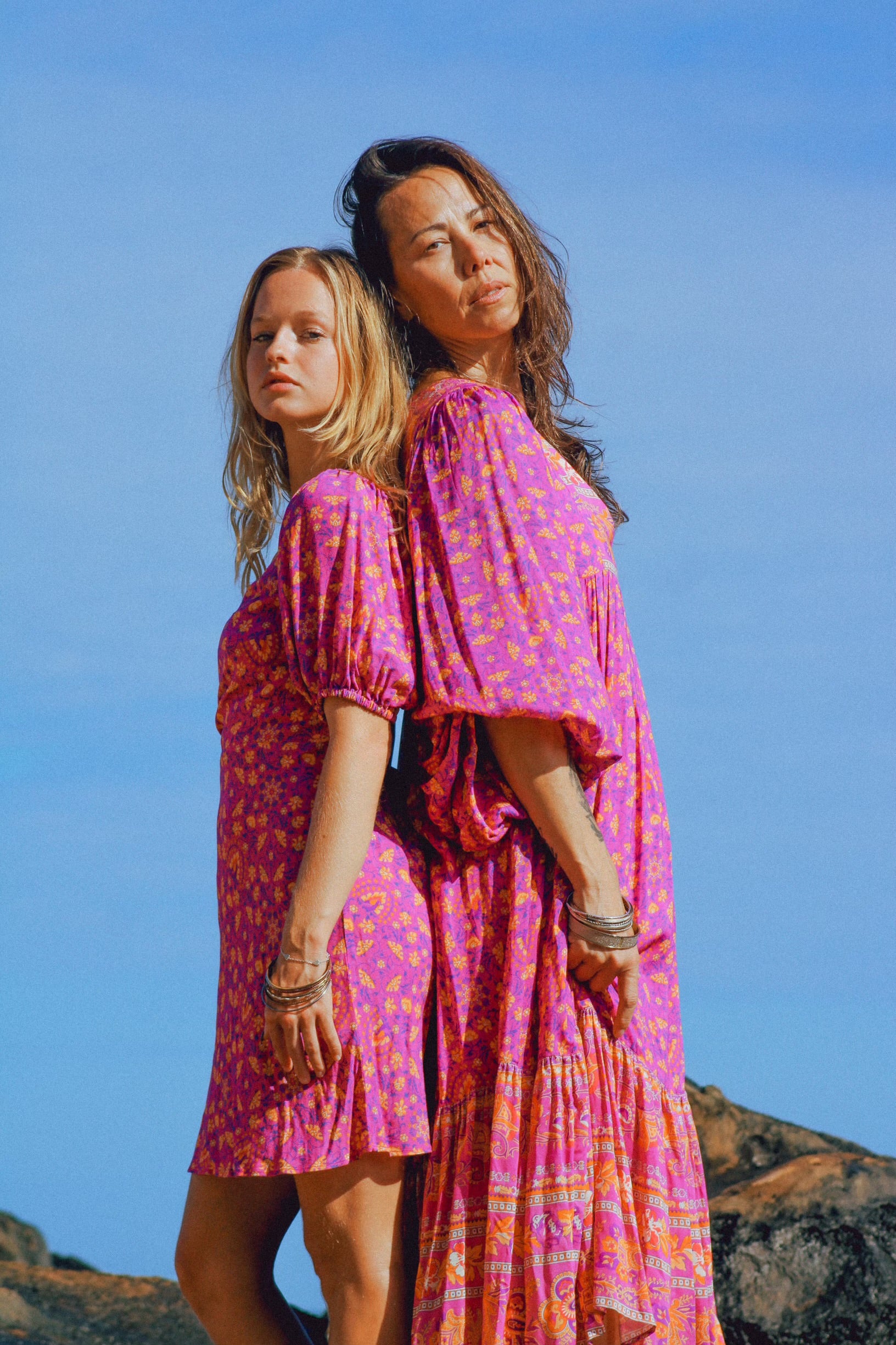 Discover the perfect blend of bohemian and romantic with the Madame Peacock Mini Dress. Featuring an eye-catching pink floral print, this dress boasts exaggerated puff sleeves and a fitted silhouette for a flirty yet elegant look. Fits True to size, model is a size XS for reference.