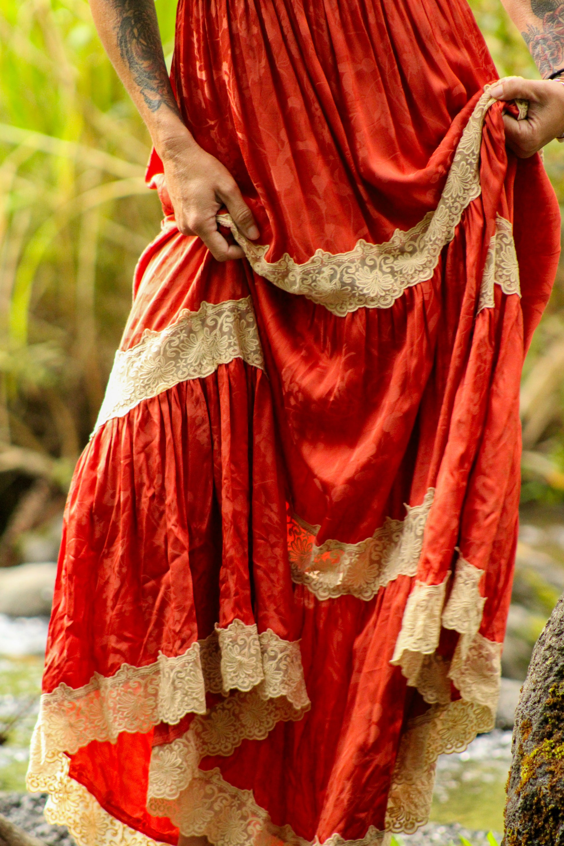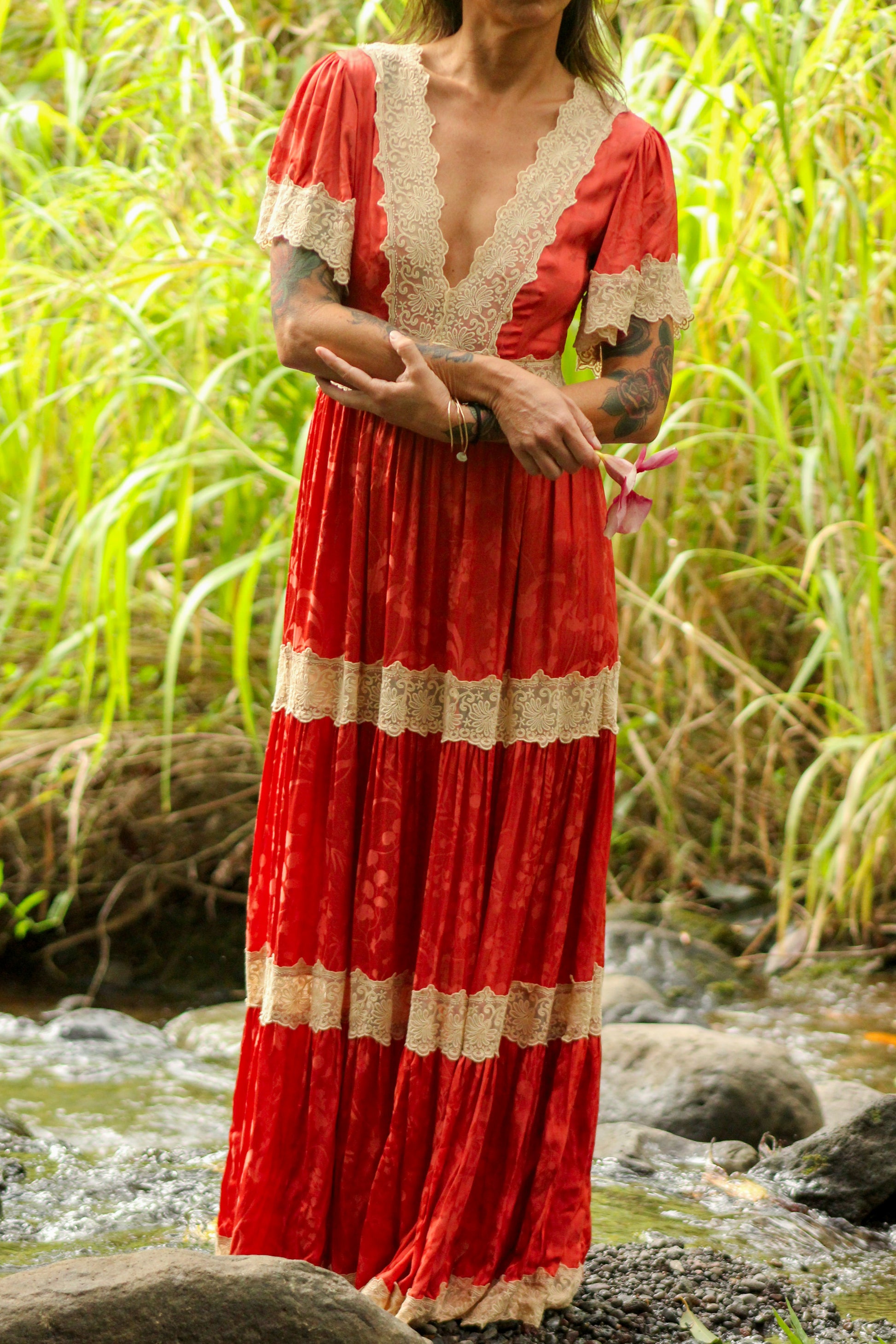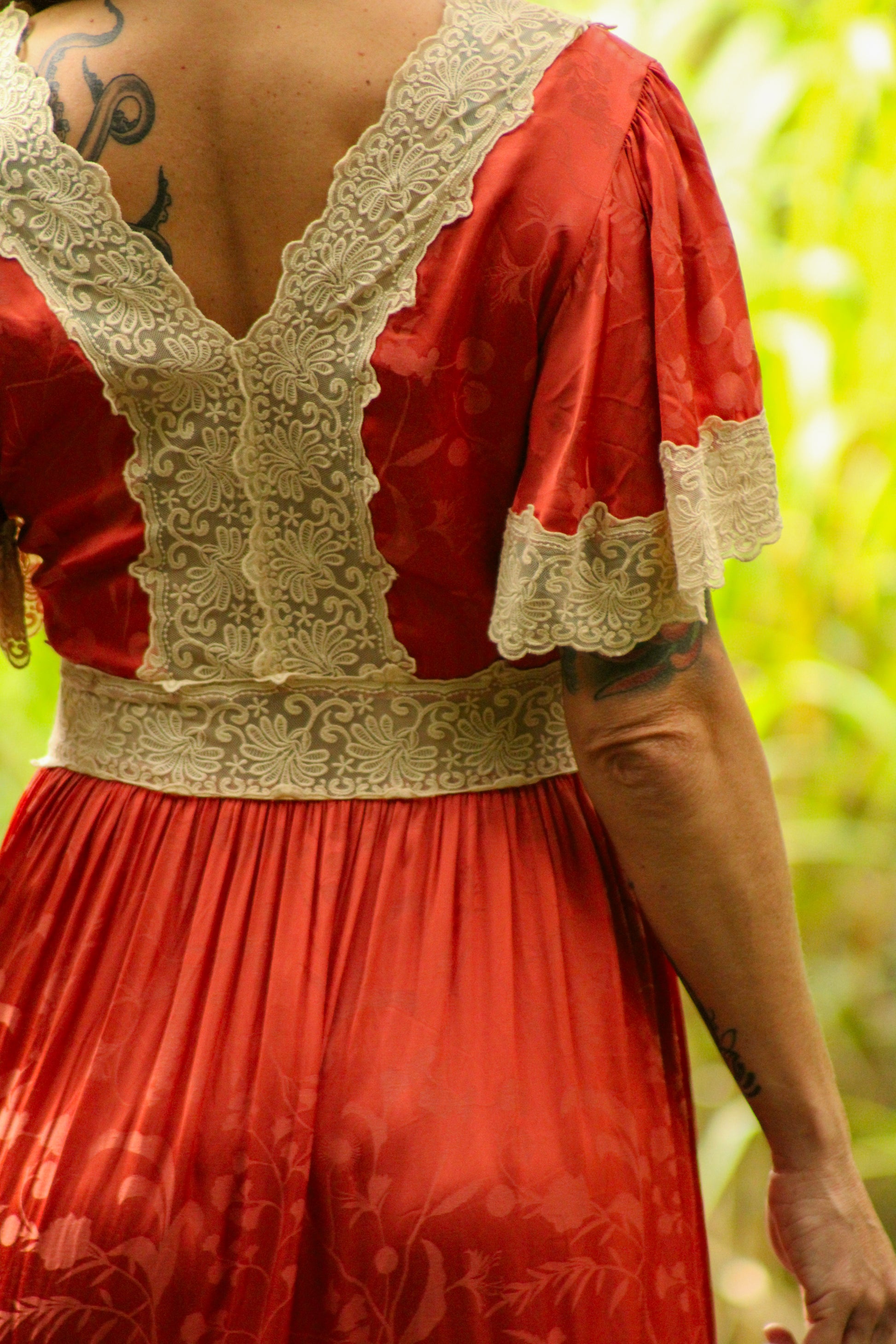 Channel your inner bohemian goddess with our vintage inspired Ocean Gown. The copper-orange floral jacquard fabric shimmers in the light with adorable flutter sleeves and delicate lace trim. A hidden side zip and v-neck give a perfect fit. Fits true to size. Model is a size Small.