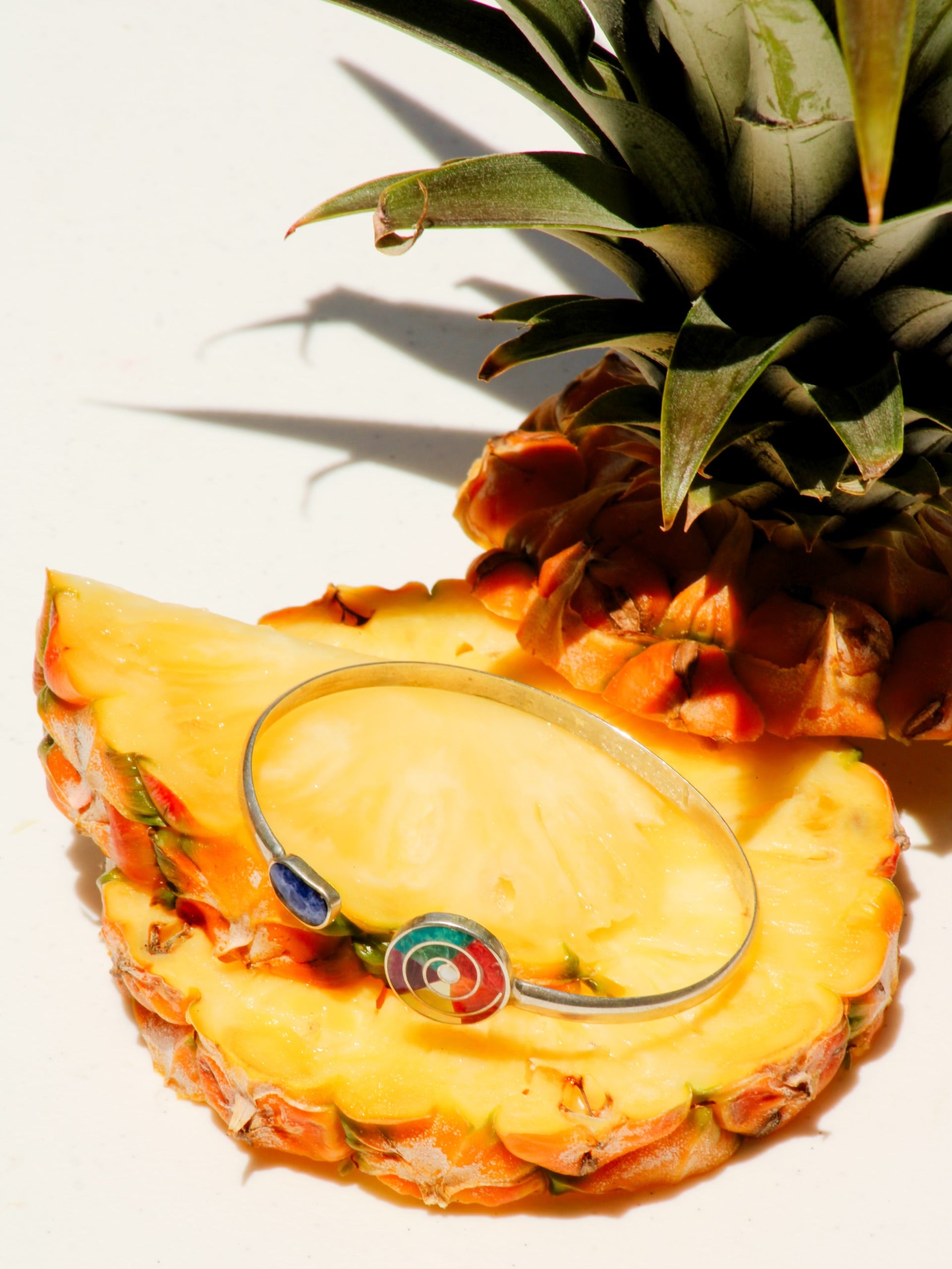 Artfully handcrafted sterling silver cuff adorned with rare rainbow gemstones. The spiral in the bracelet represents growth, evolution, and the cycles of life.