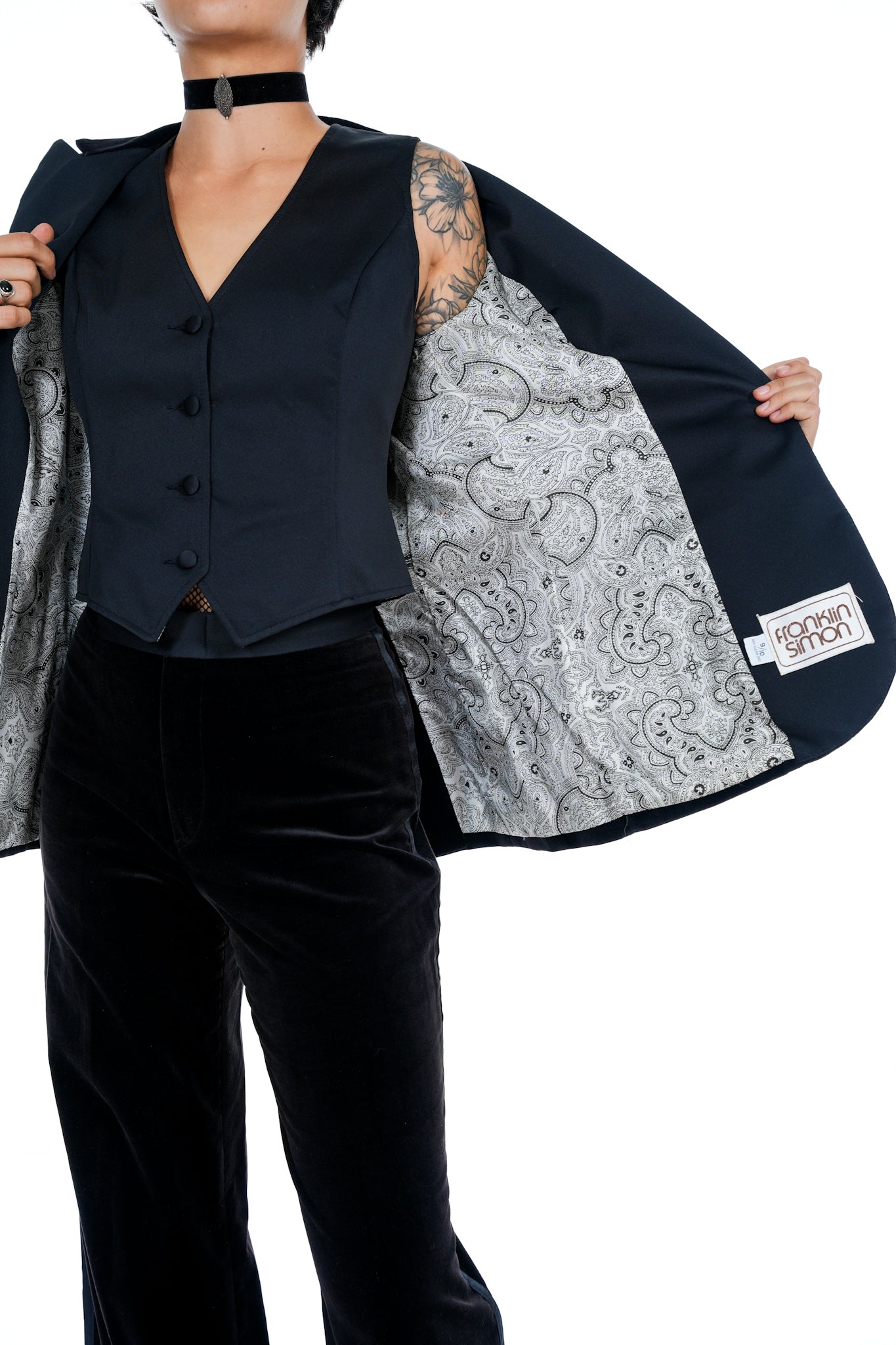 This expertly crafted 1970s black velvet three-piece suit features a distinctive exaggerated collar and a fully lined jacket with black-and-white paisley, showcasing meticulous attention to detail. The high-waisted trousers include pockets, combining classic tailoring with functional elegance.