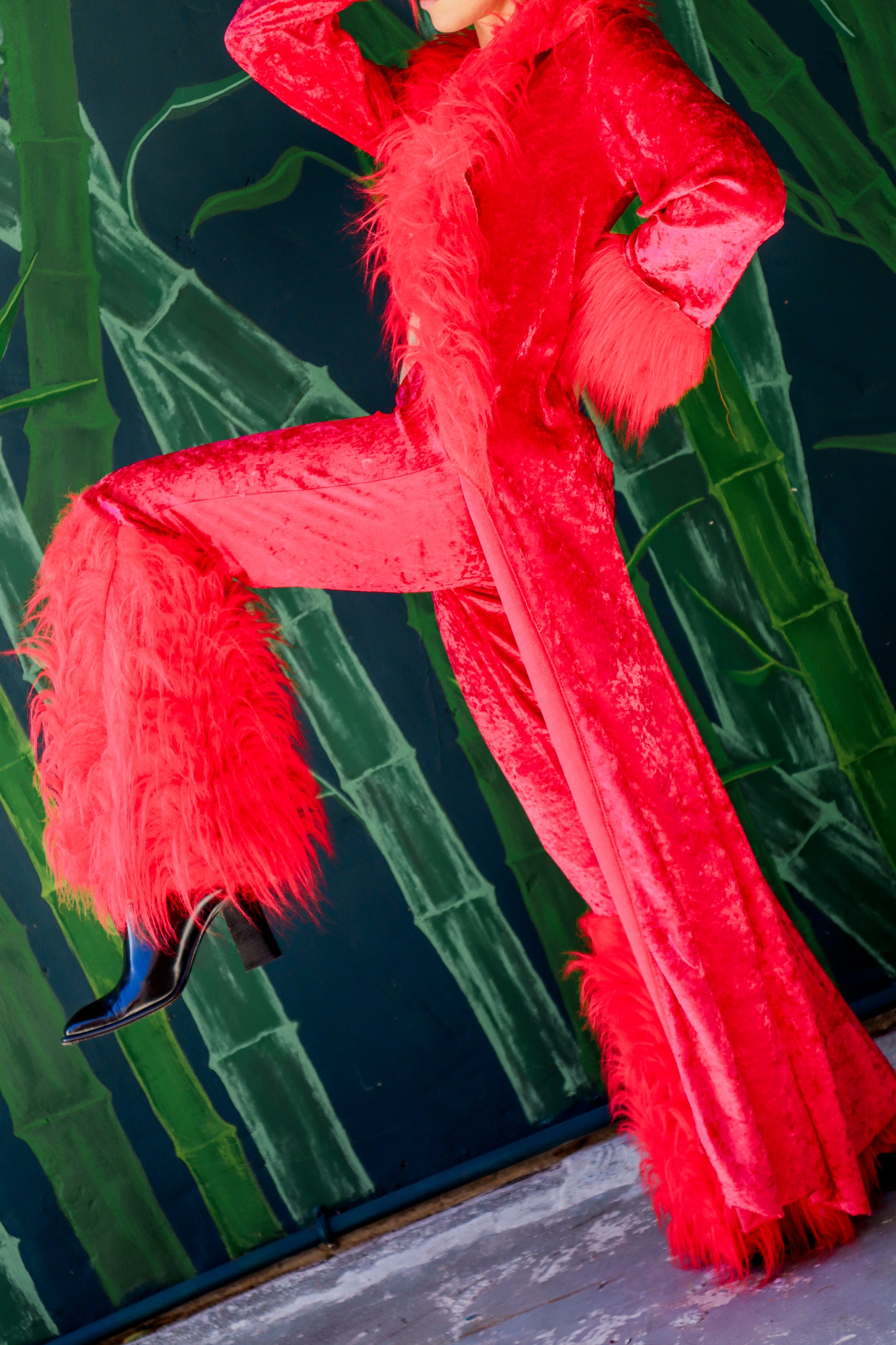 Wrap yourself in opulence with this vintage velvet red fluff pants and duster set. The rich, plush fabric and bold red hue make it the perfect combination of cozy elegance and statement style, ready to turn any outfit into a showstopper!