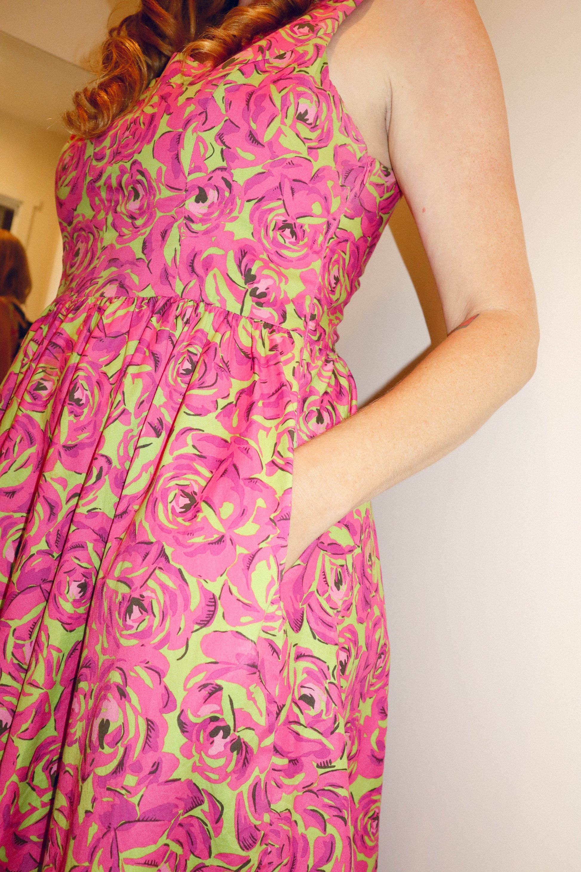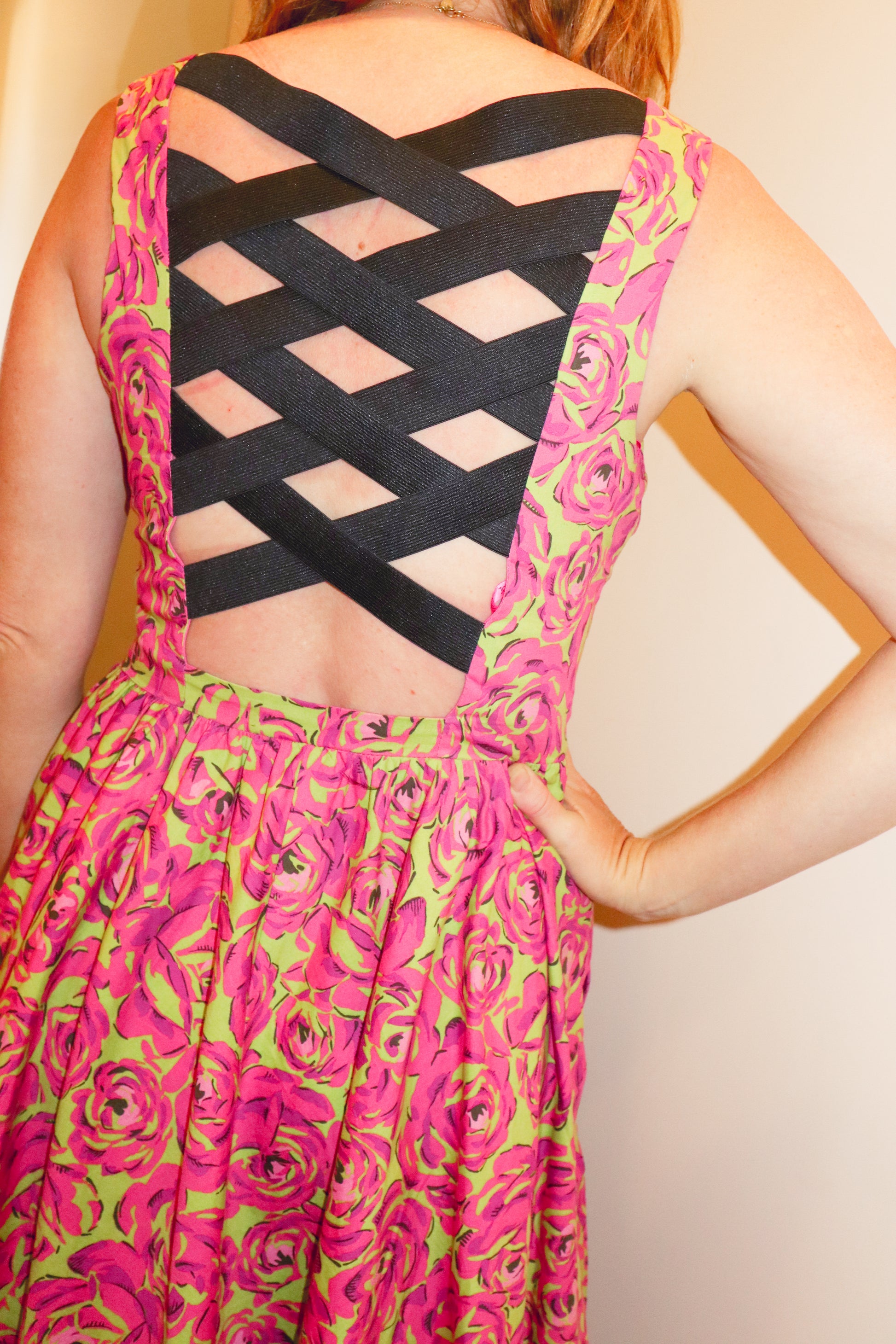 This vintage early 2000s Betsey Johnson dress features a delicate pink and green floral pattern with a strappy black back, fitted bodice, and flared skirt. Its zip closure offers easy wear, making it a versatile choice for a range of occasions.